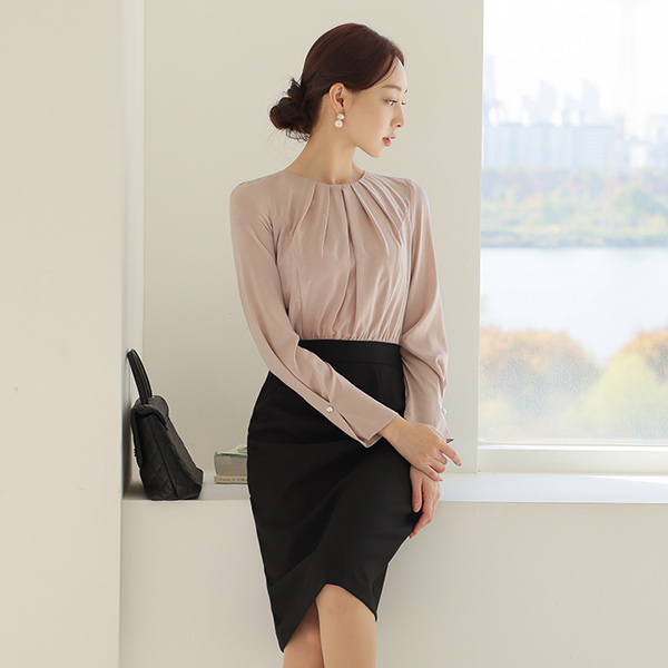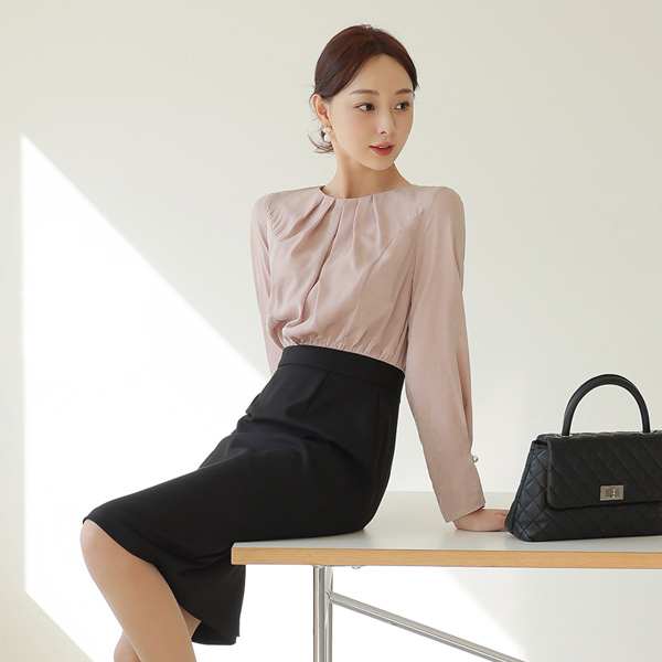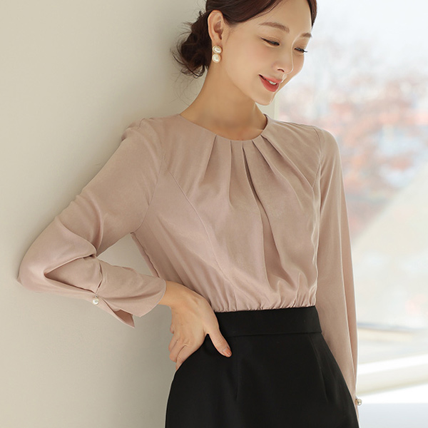 네크라인에 더해진 핀턱 셔링으로 풍성한 실루엣을