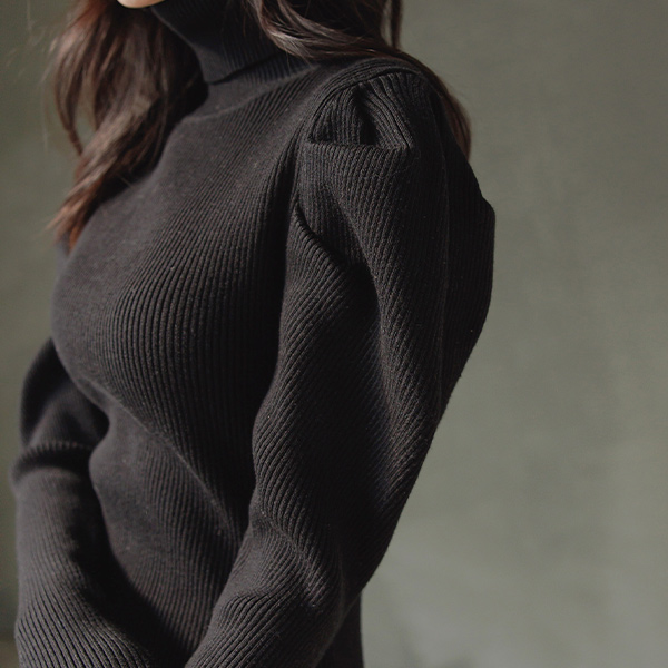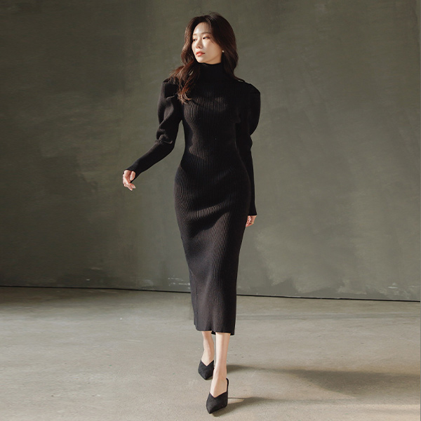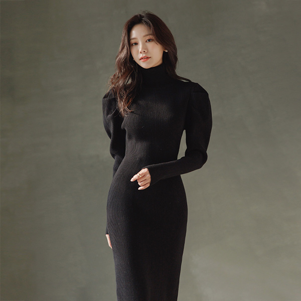 泡泡袖 超长 开衩 高领 针织衫 连衣裙