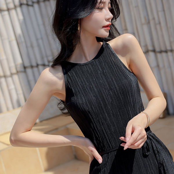 홀터넥 디자인의 플리츠 원피스