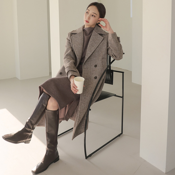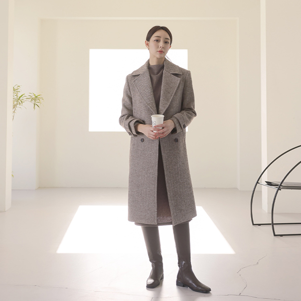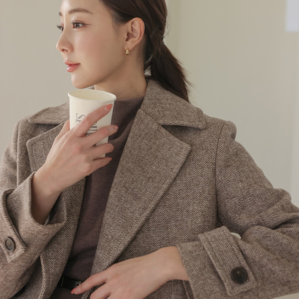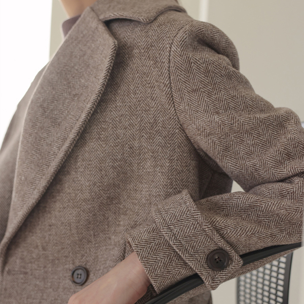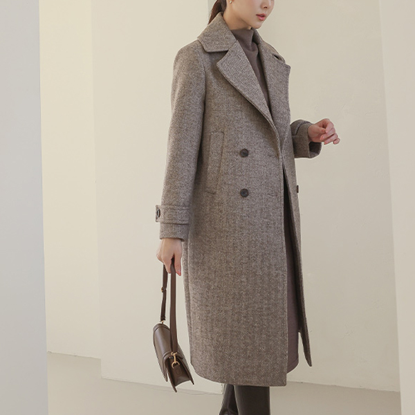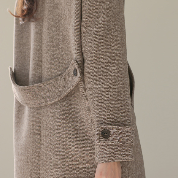 宽松 领子 人字呢 双 扣子 羊毛 大衣