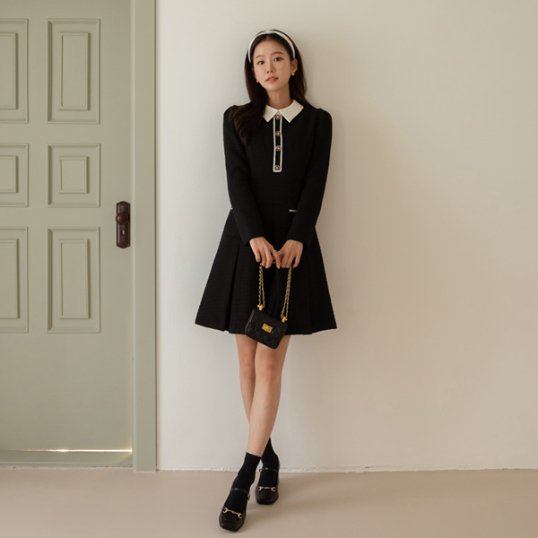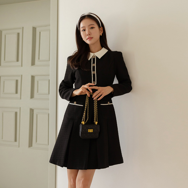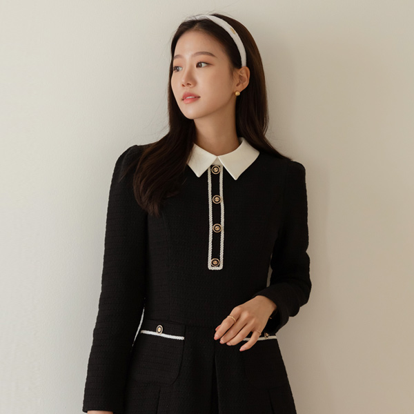 Haze 翻领 粗呢 褶边 连衣裙
