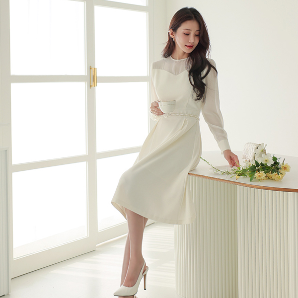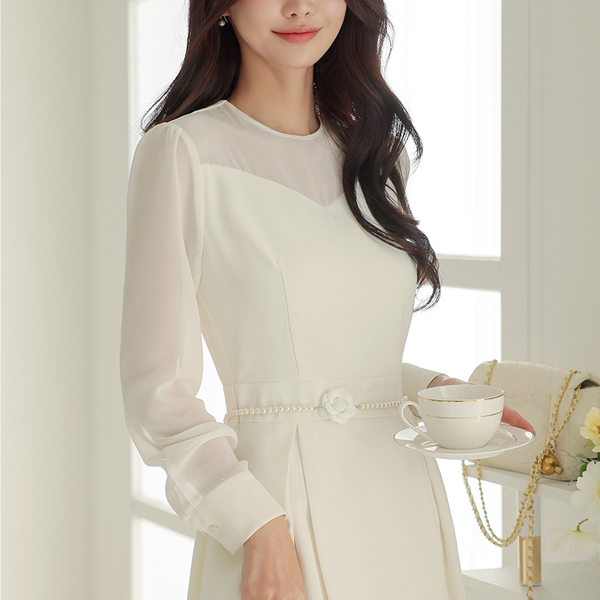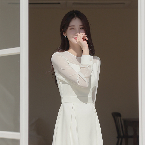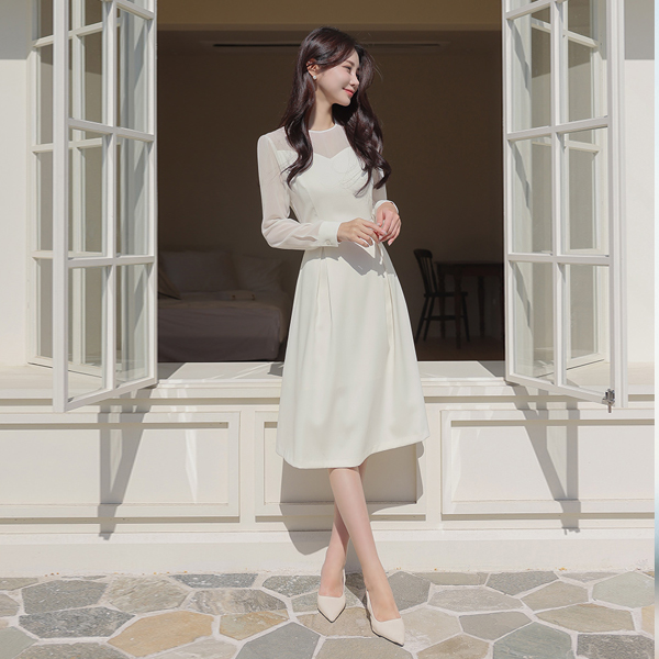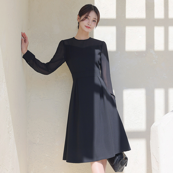透视 雪纺 配色 心形线条 细褶 连衣裙