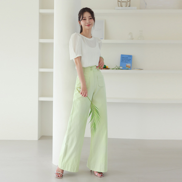 去皱纹 细褶 泡泡袖 袖 7分裤 罩衫