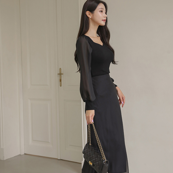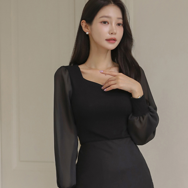 心形领 雪纺 袖 配色 T恤衫