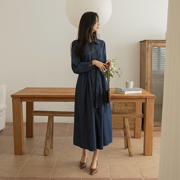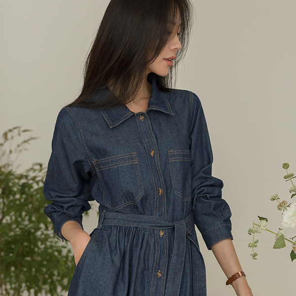 基本 扣子 后侧松紧带 牛仔色 连衣裙