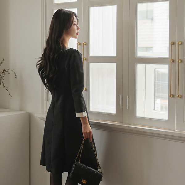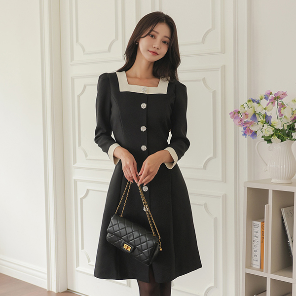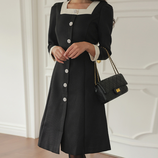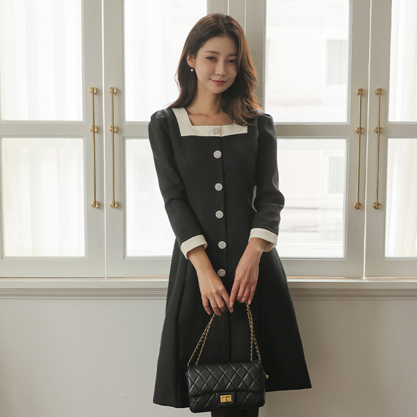 浪漫 方领 配色 珍珠宝石 扣子 粗呢 连衣裙