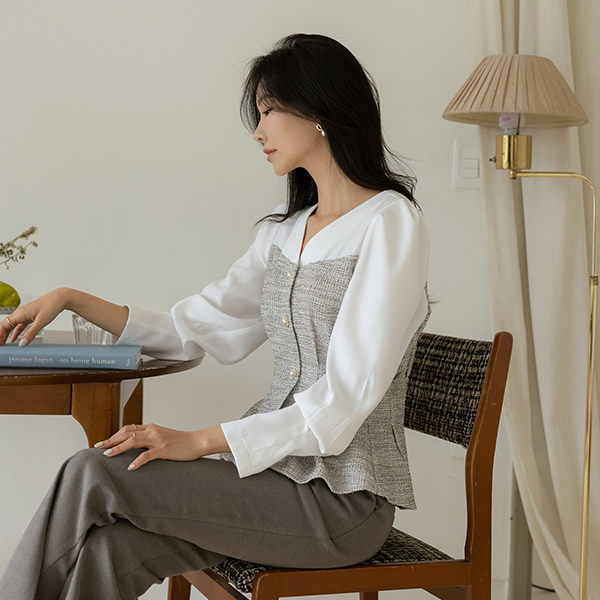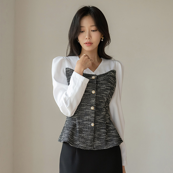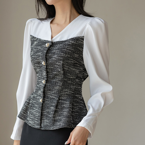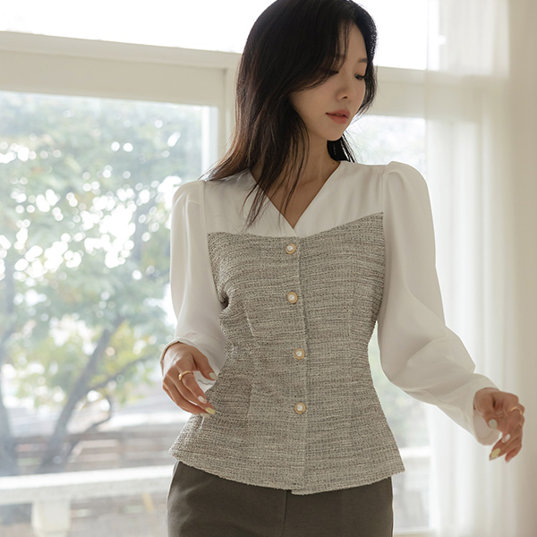 优雅 珍珠 扣子 配色 粗呢 修身 罩衫