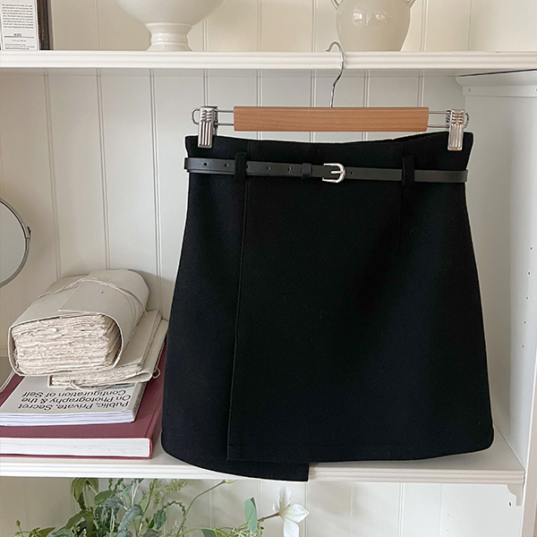 不对称 底端 细密 迷你 裙子 (腰带SET)