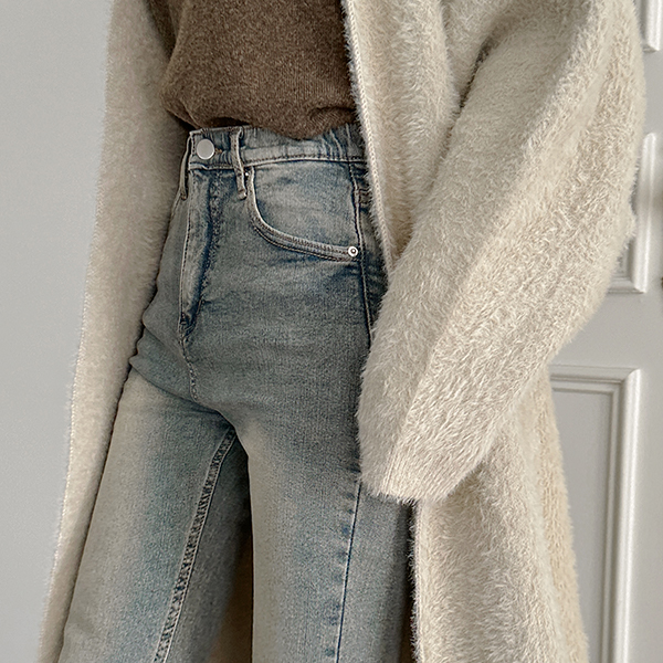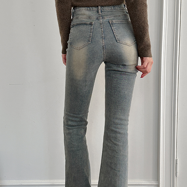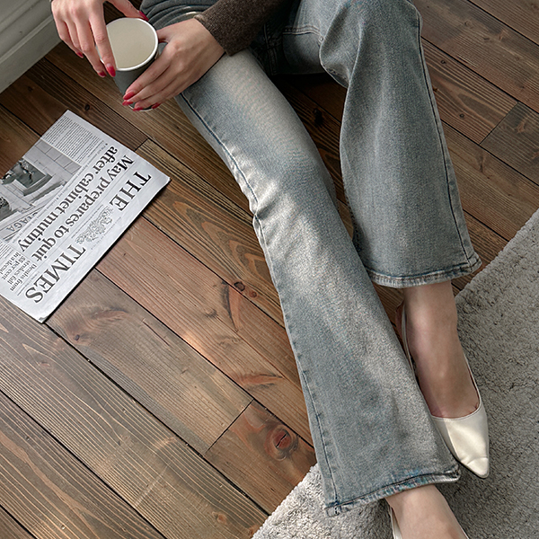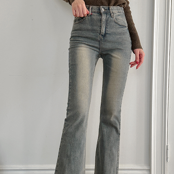 复古 颜色 里面松紧带 斯利姆 喇叭 牛仔色 裤子 (衬里加绒)