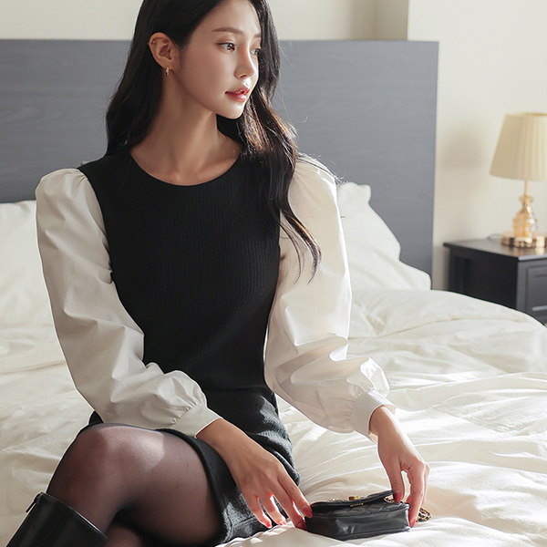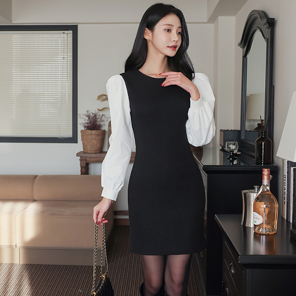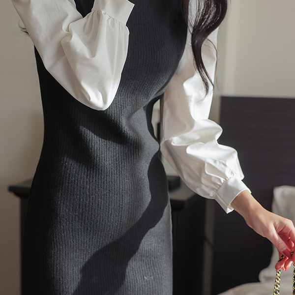 泡泡袖 袖 针织衫 配色 斯利姆 迷你 连衣裙