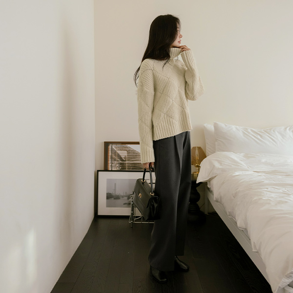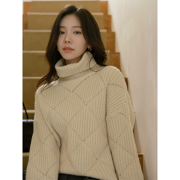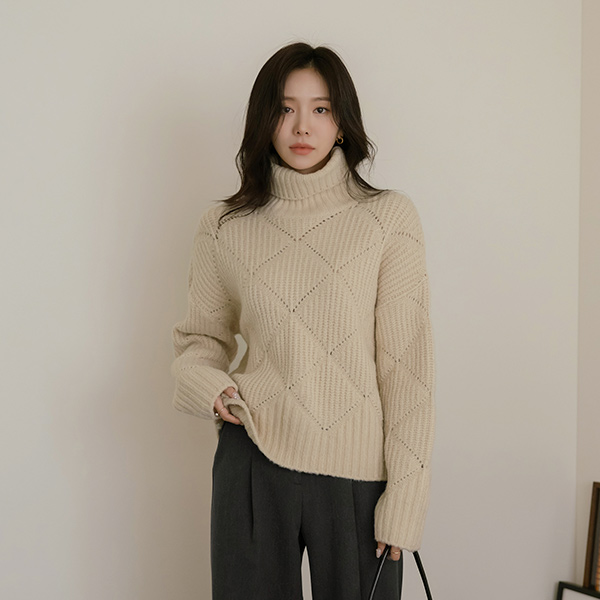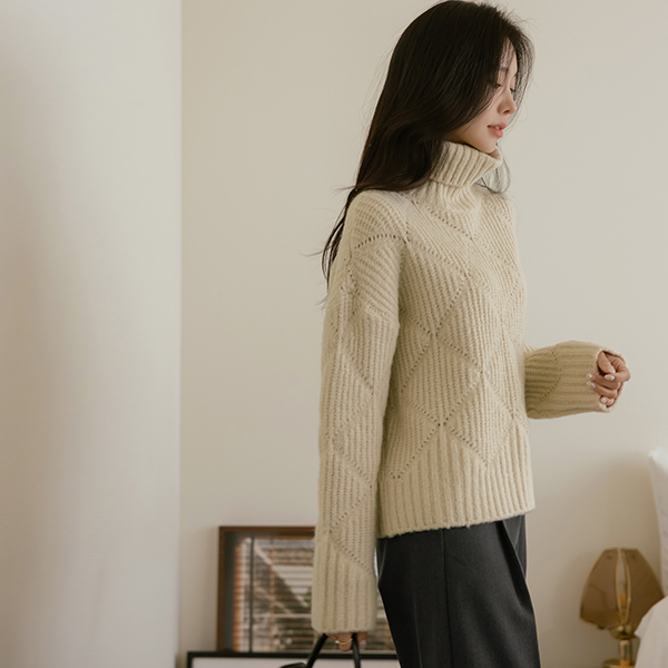 钻石 编织的 宽松 羊毛 高领 针织衫