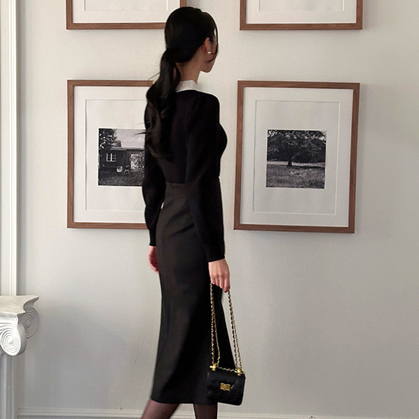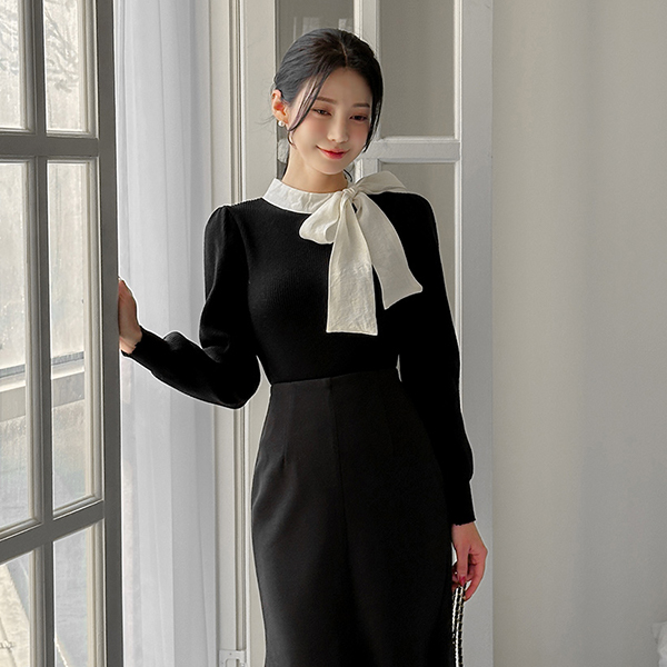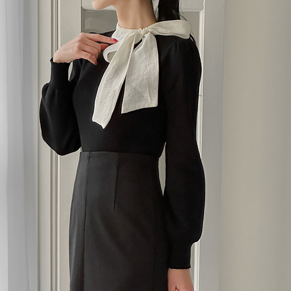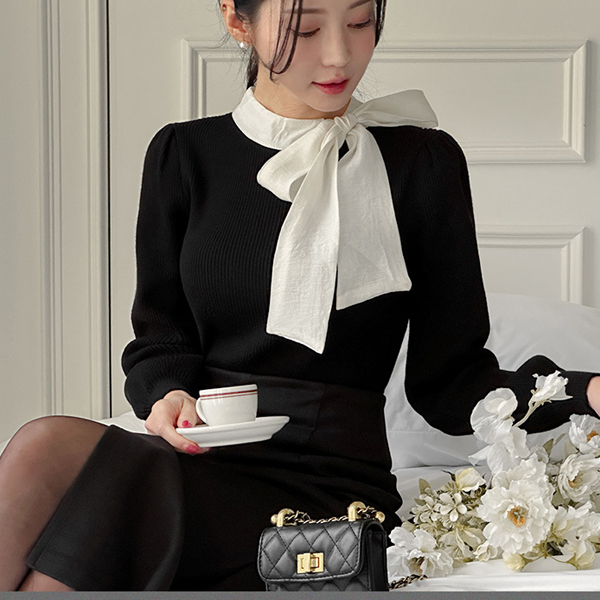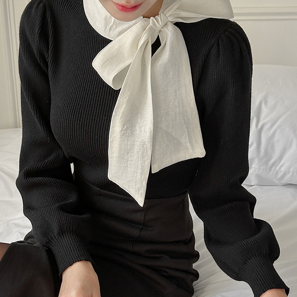 浪漫 配色 蝴蝶结 领带 泡泡袖 针织衫