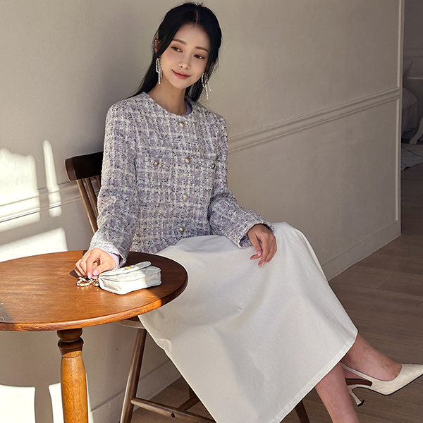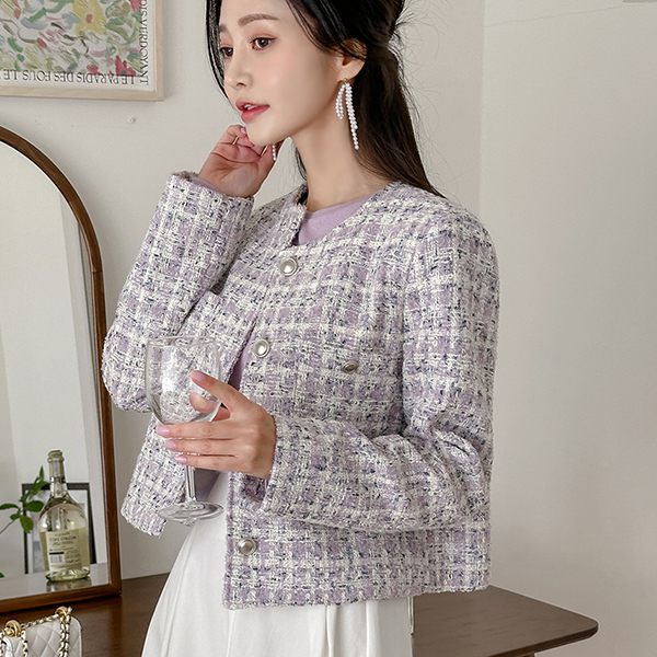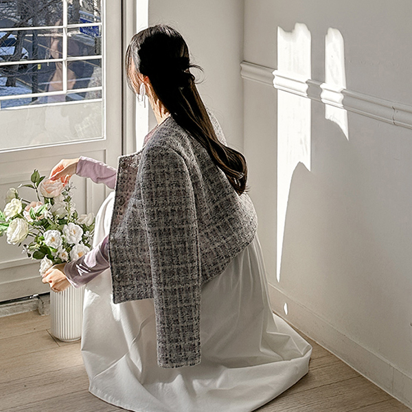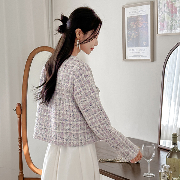 格子 粗呢 圆领 Silver 扣子 夹克