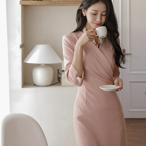 폴딩넥 裹身 侧纽 褶皱 7分袖 开衩 弹力 连衣裙
