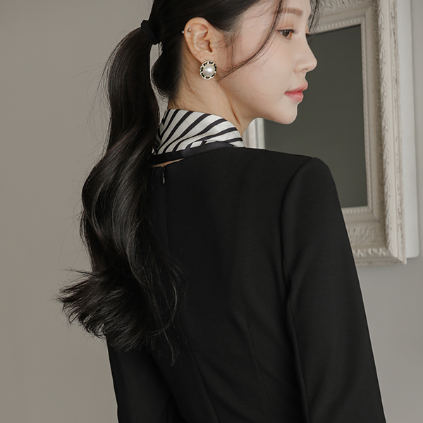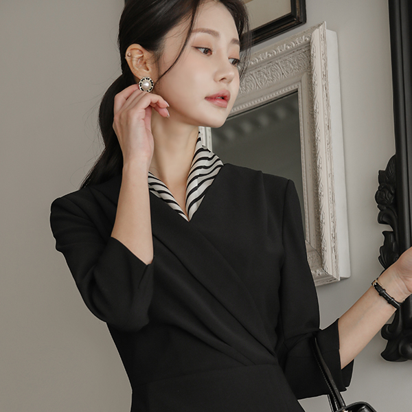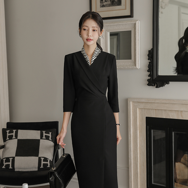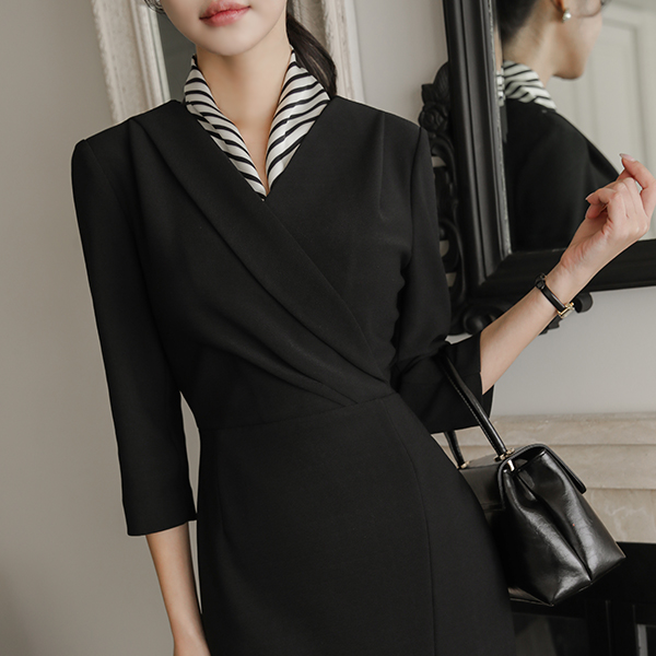 폴딩넥 裹身 侧纽 褶皱 7分袖 开衩 弹力 连衣裙
