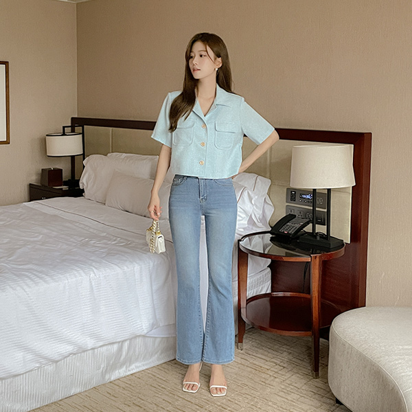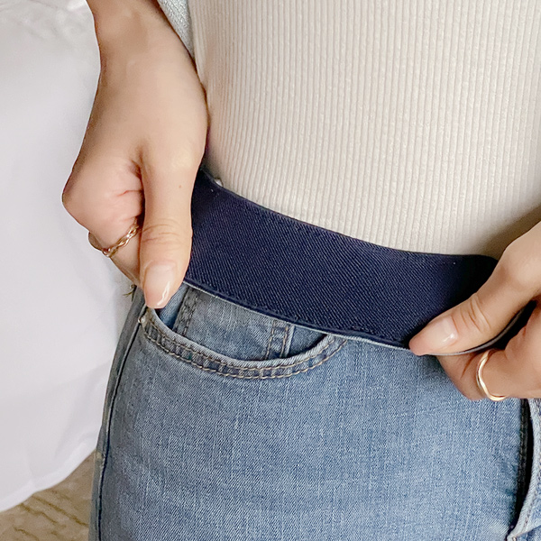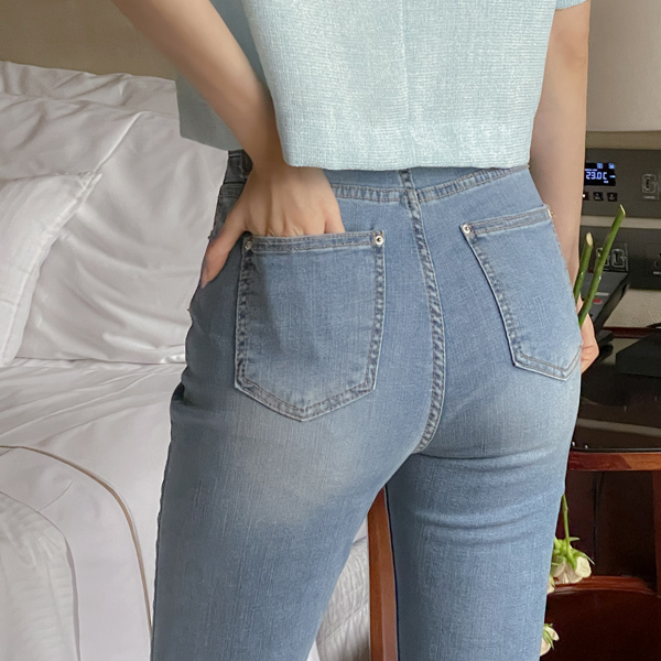 细密 夏天 隐藏 松紧带 喇叭 牛仔色 裤子