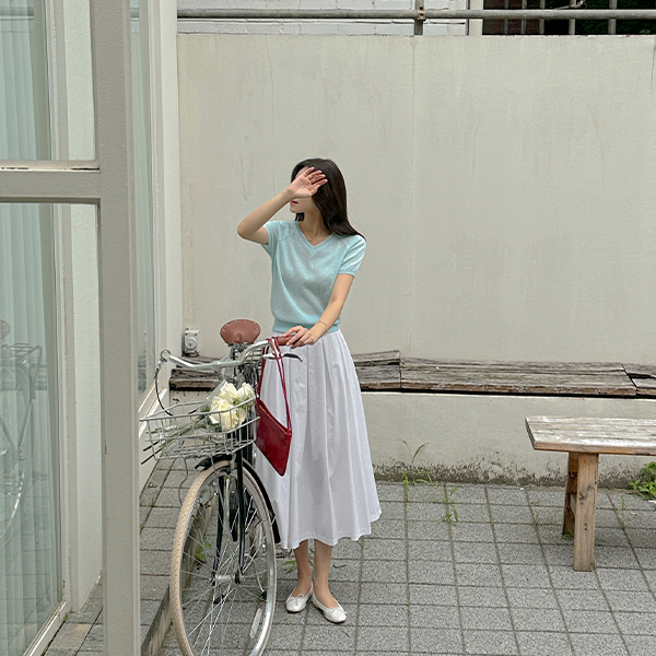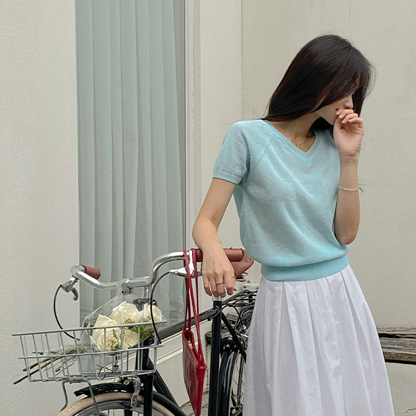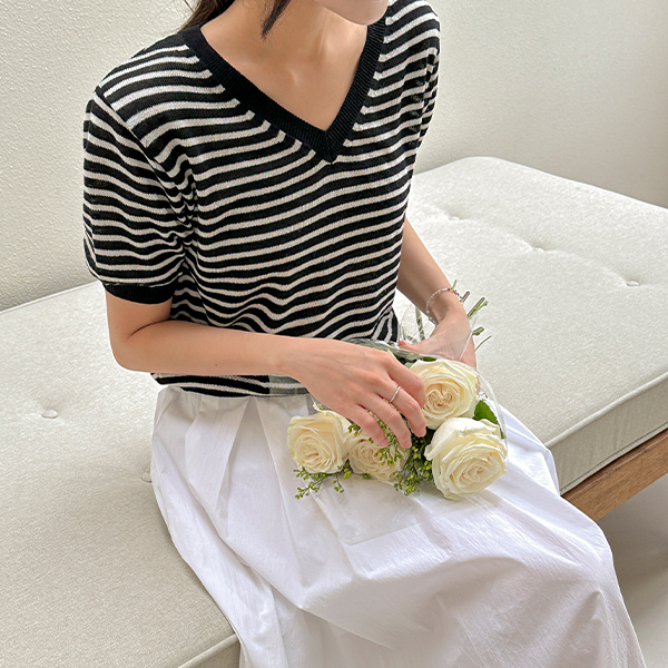 V领 横条纹 亚麻 短袖 针织衫