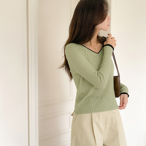 配色 V领 苗条 条绒 针织衫