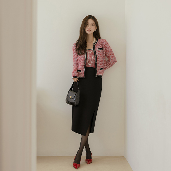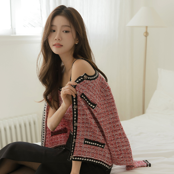 珍珠 粗呢 格子 背心&开衫 SET
