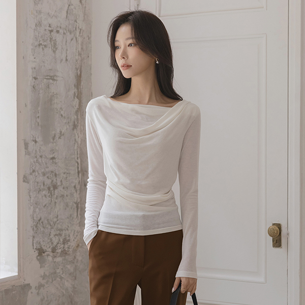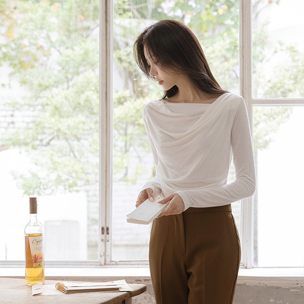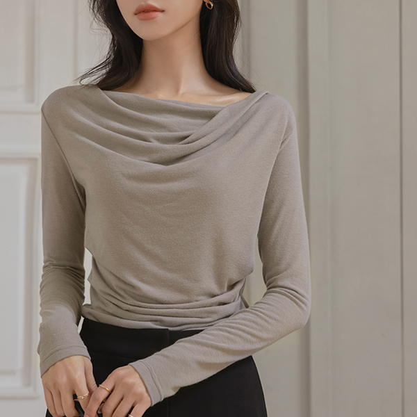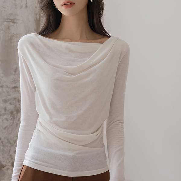 苗条 喇叭式 褶皱领 弹力 T恤衫