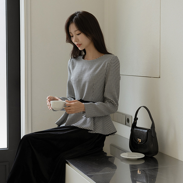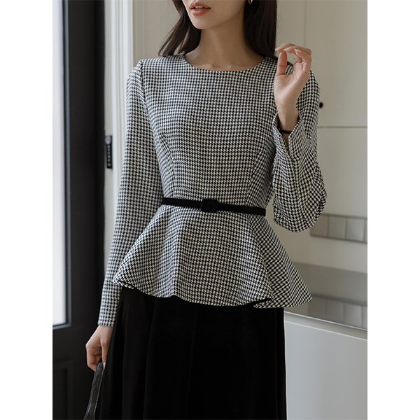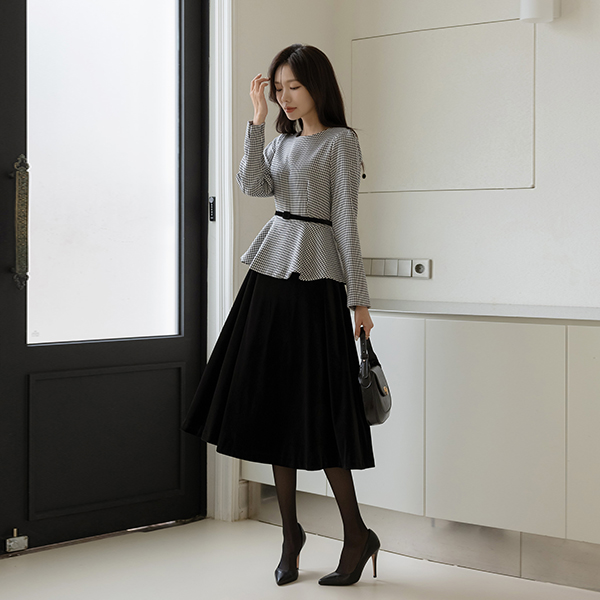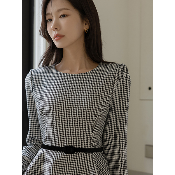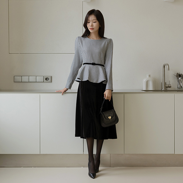 格子 丝绒 配色 腰带 (套装) 连衣裙