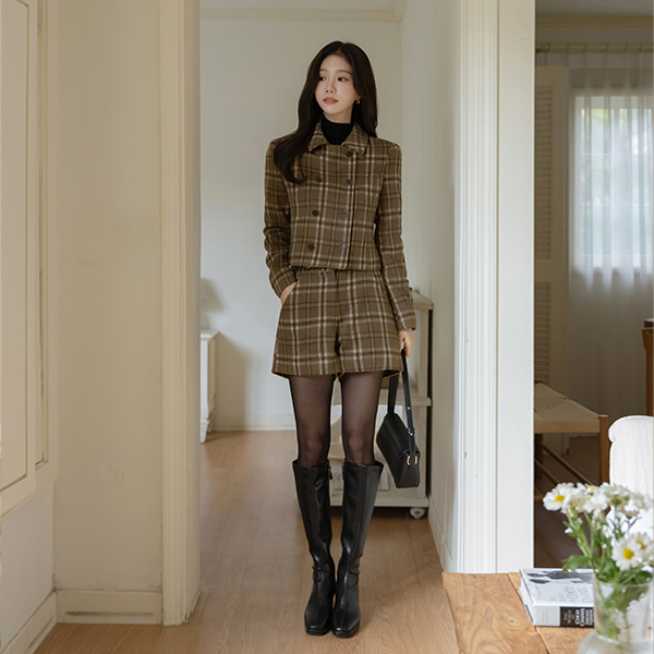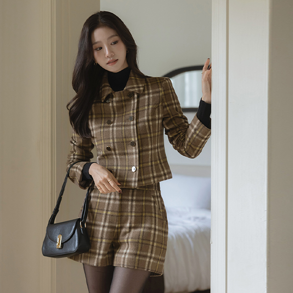 柔软的 羊毛 格子 双 扣子 Set-up 夹克