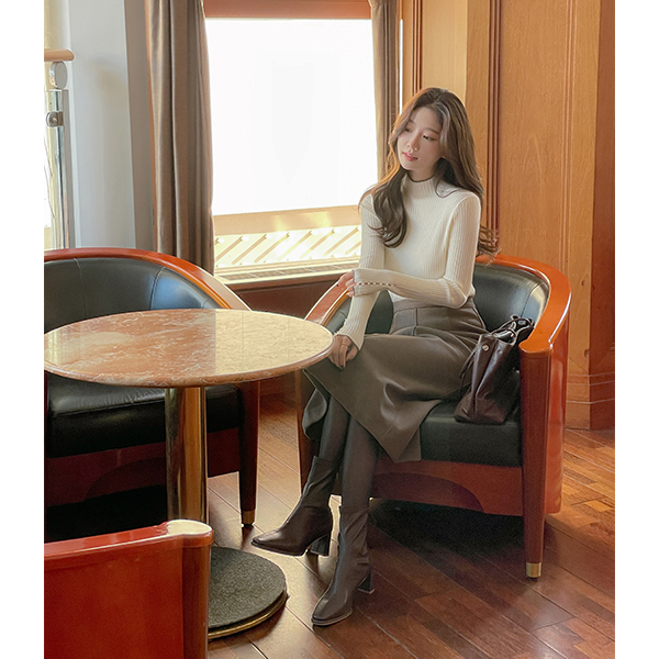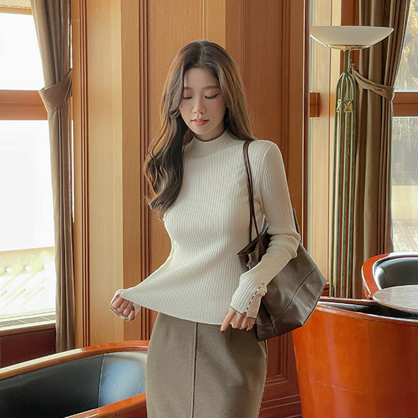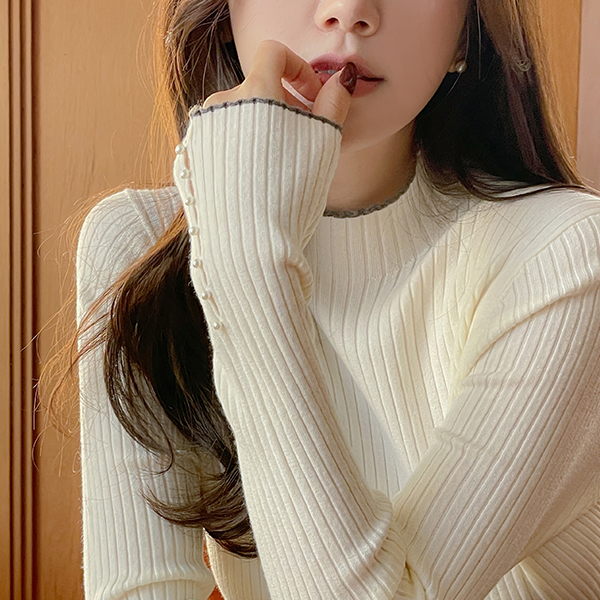 配色 珍珠 袖 羊毛 高领 针织衫
