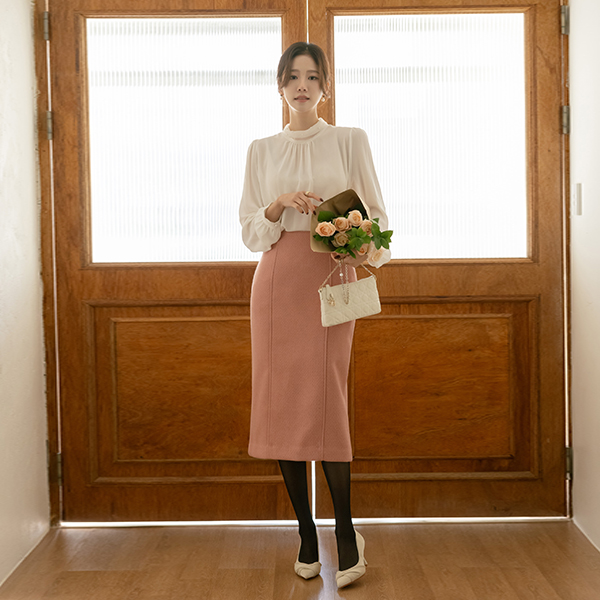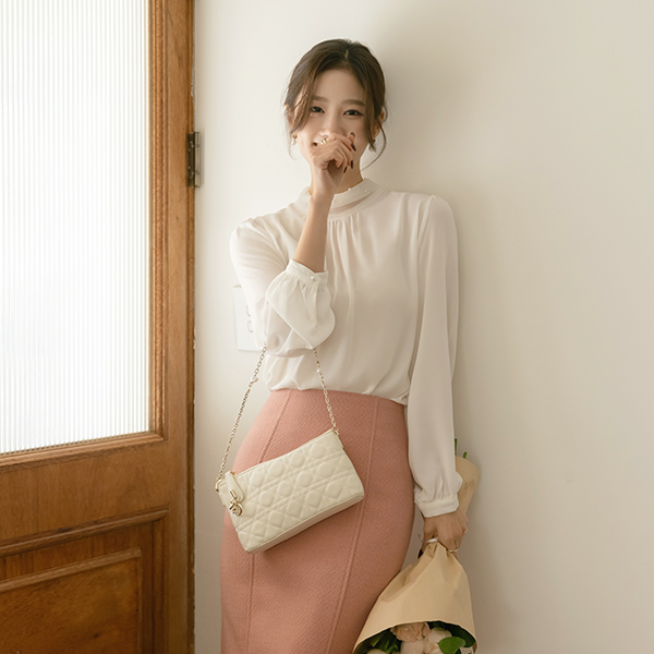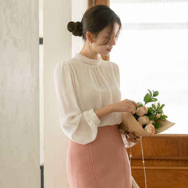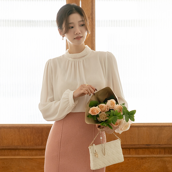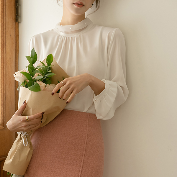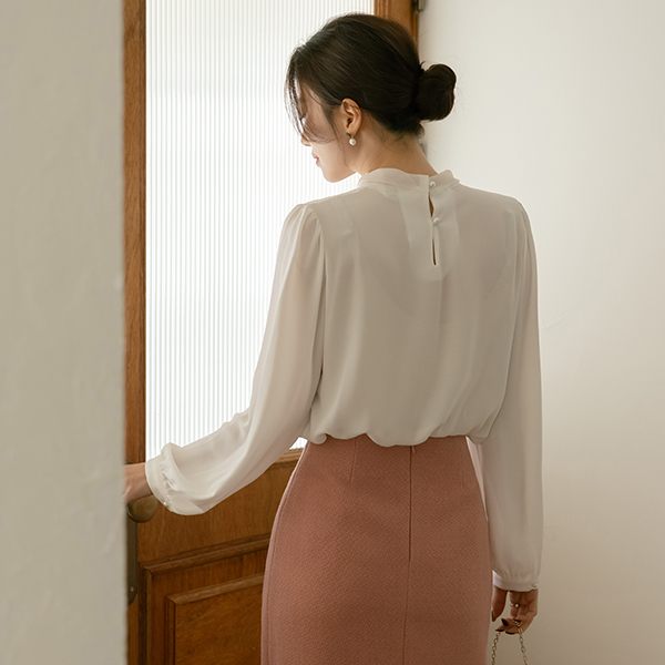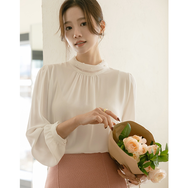珍珠 透明硬纱 半高领 泡泡袖 罩衫