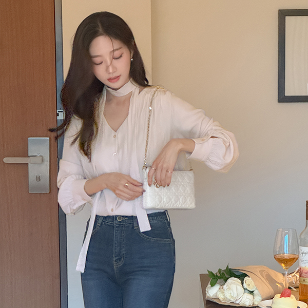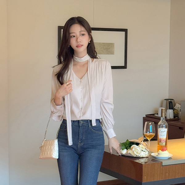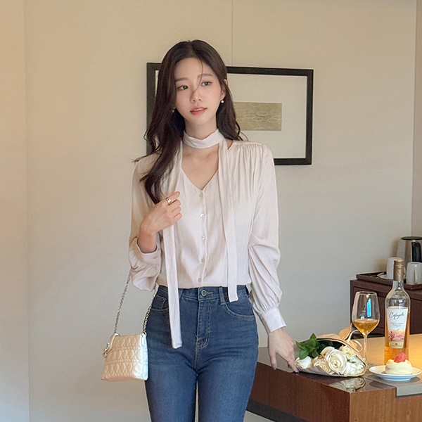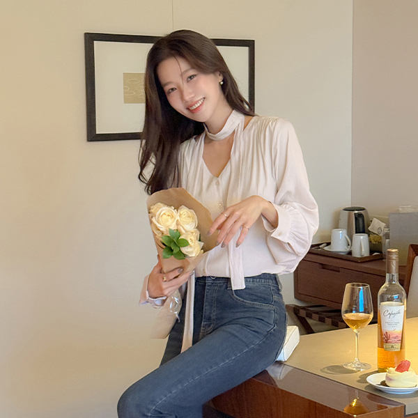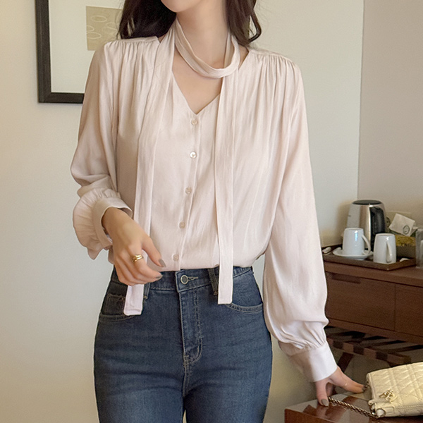 멜로 褶皱 领带 罩衫