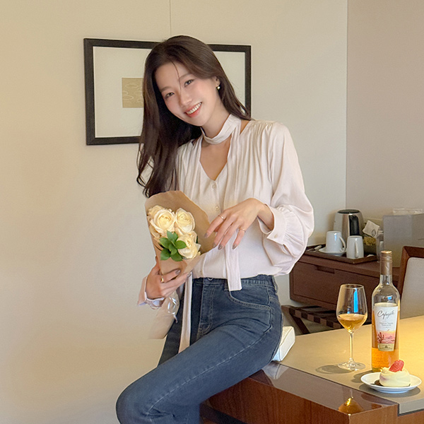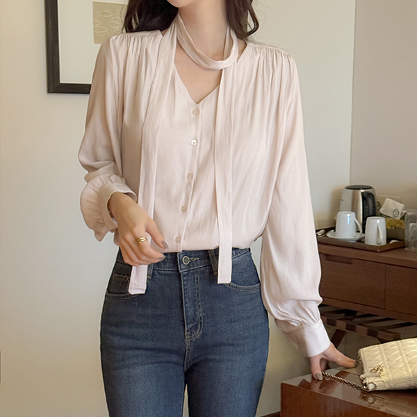 멜로 褶皱 领带 罩衫