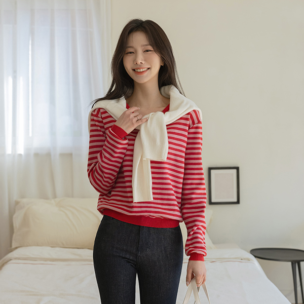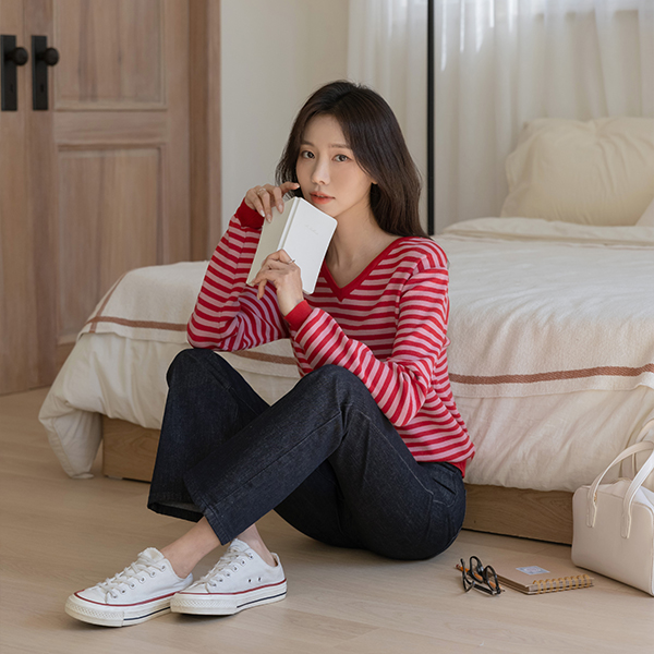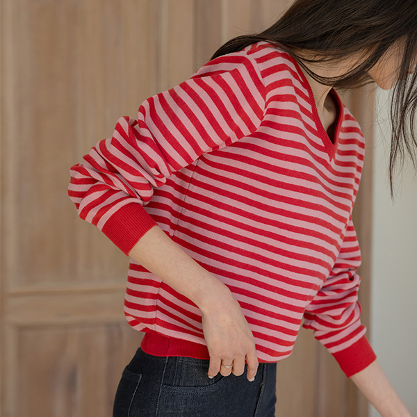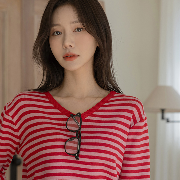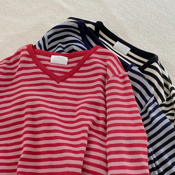 밍키 柔丝 横条纹 V字领 针织衫