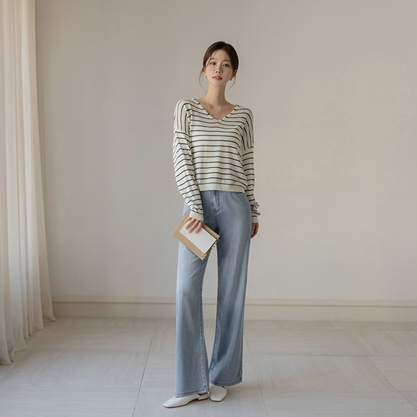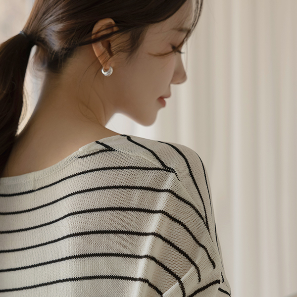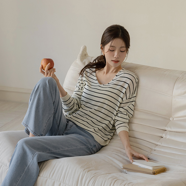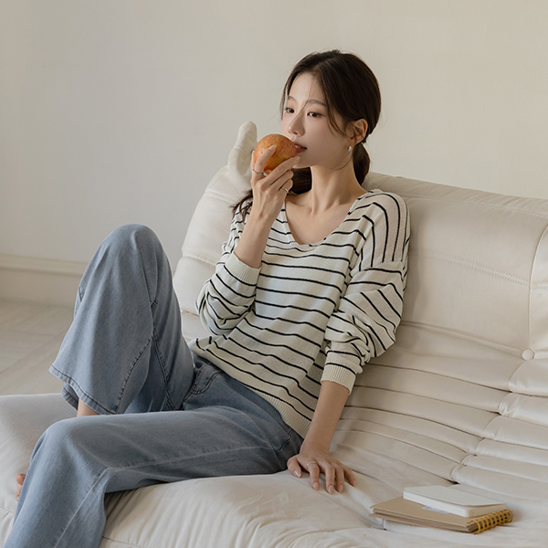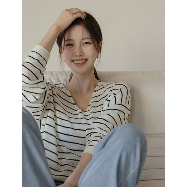 亚麻 苗条 宽松 V领 横条纹 针织衫