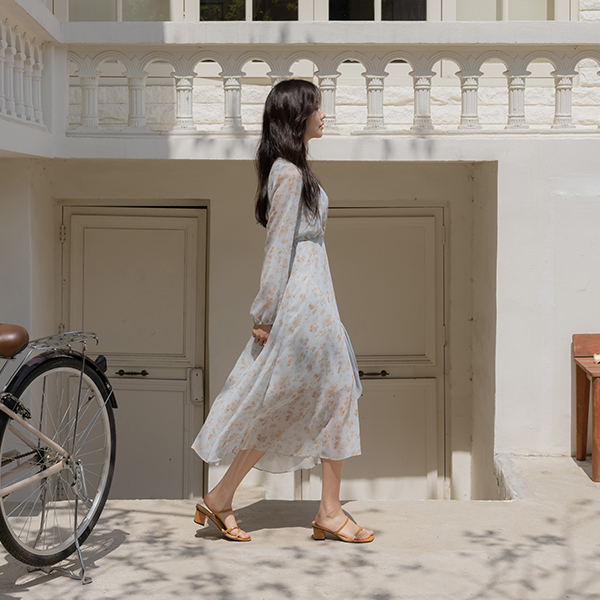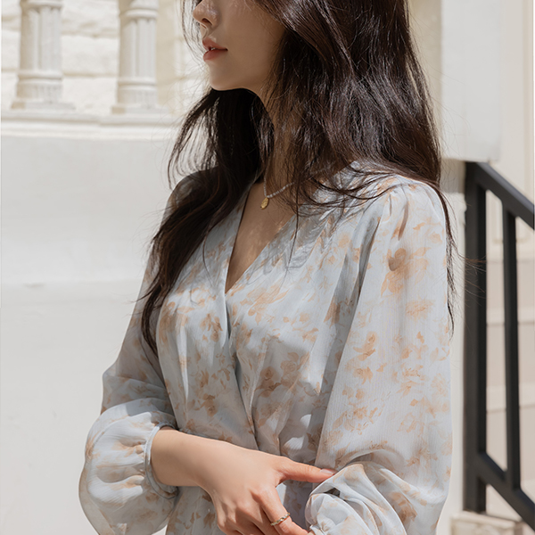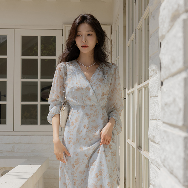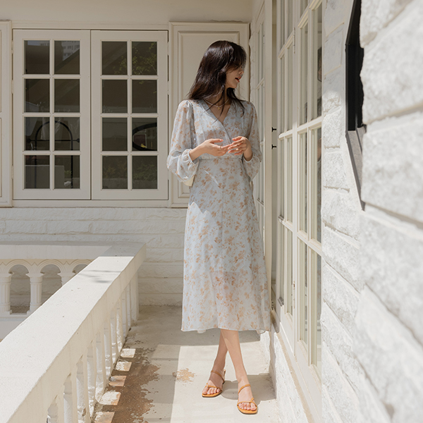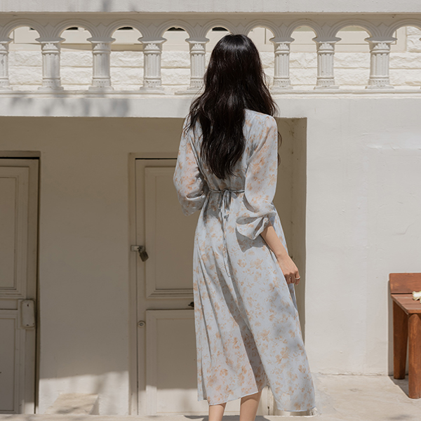 苗条 V字领 印染 雪纺 连衣裙