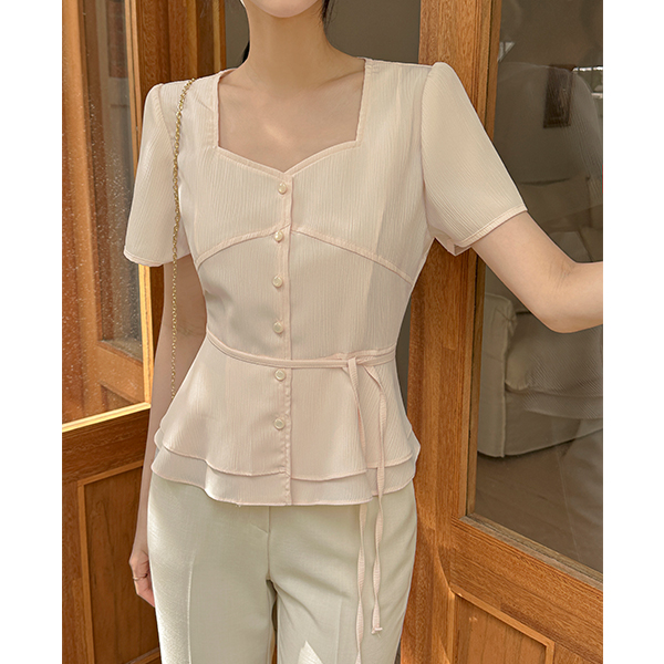 纯正 오각넥 二重 配色 荷叶边 罩衫(+腰带)