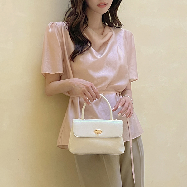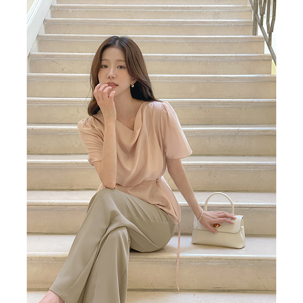 Loel 有光泽 堆领 短袖 罩衫(+腰带)