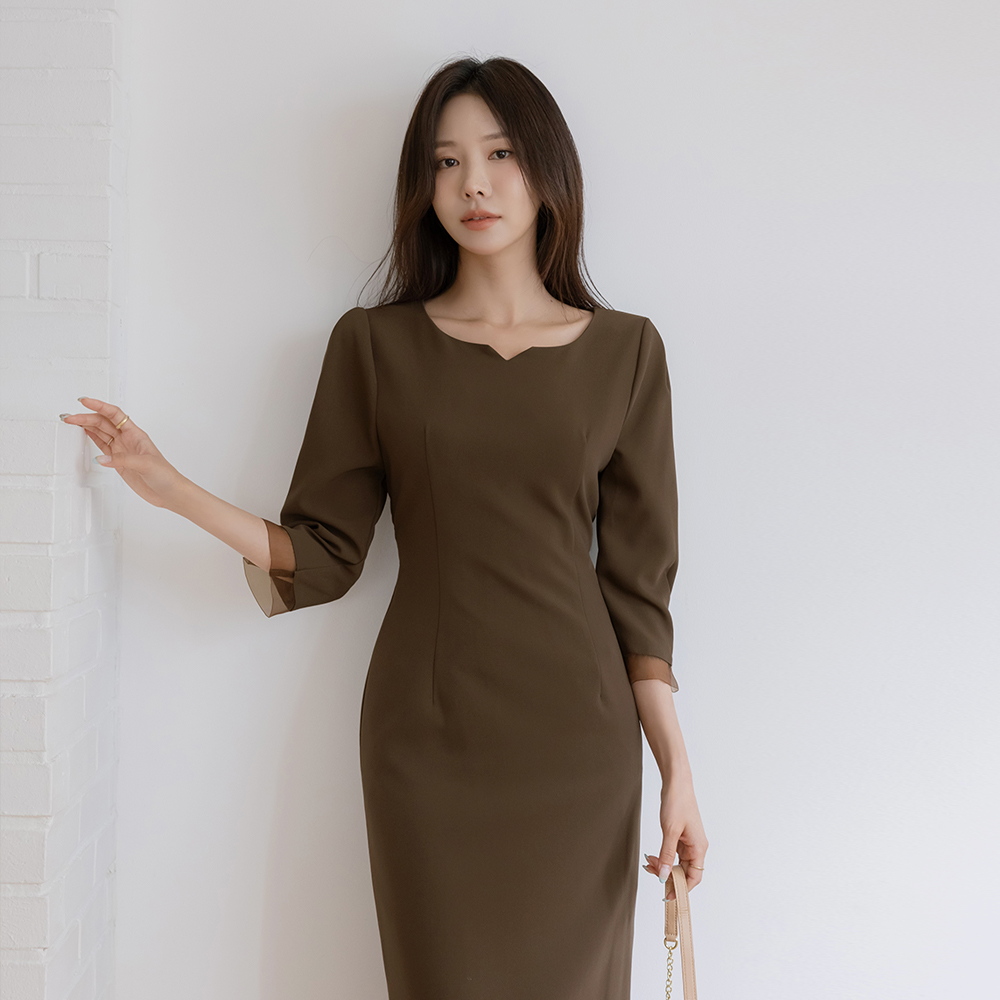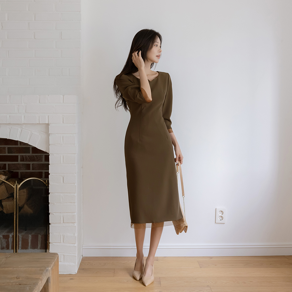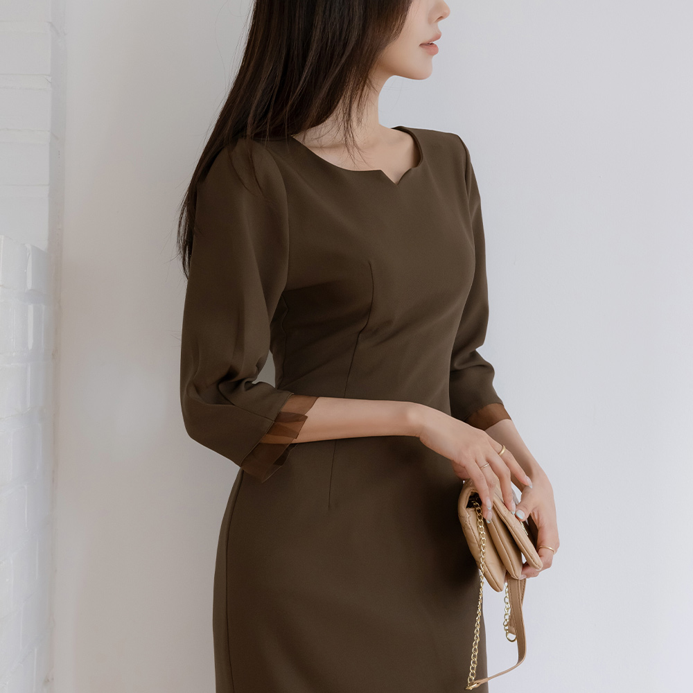 透明硬纱 配色 H字型 7分 连衣裙