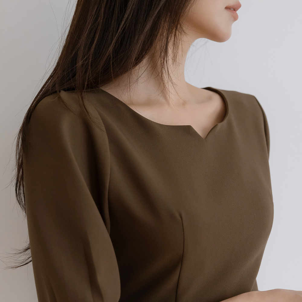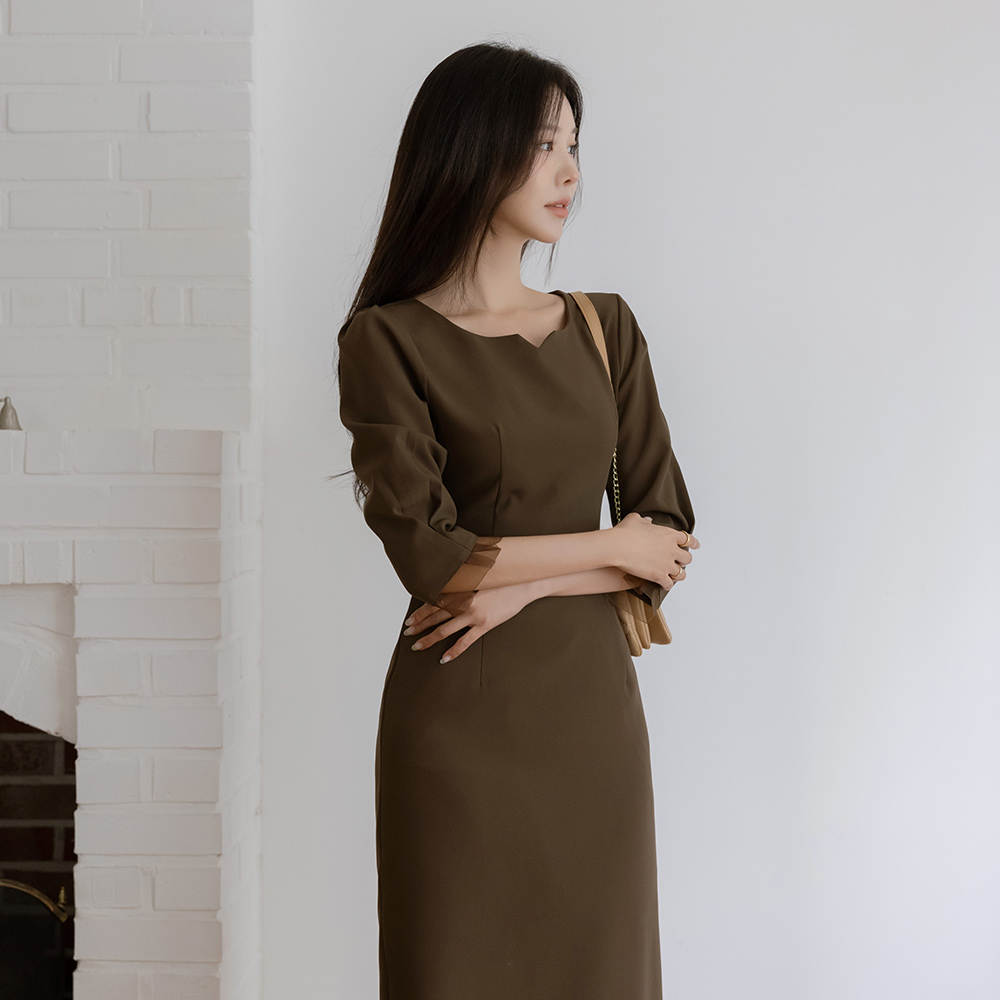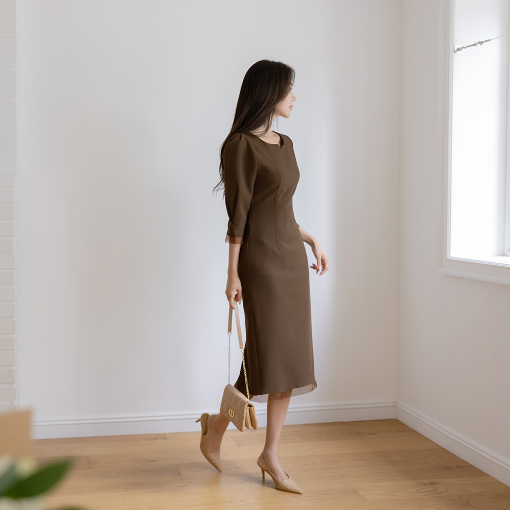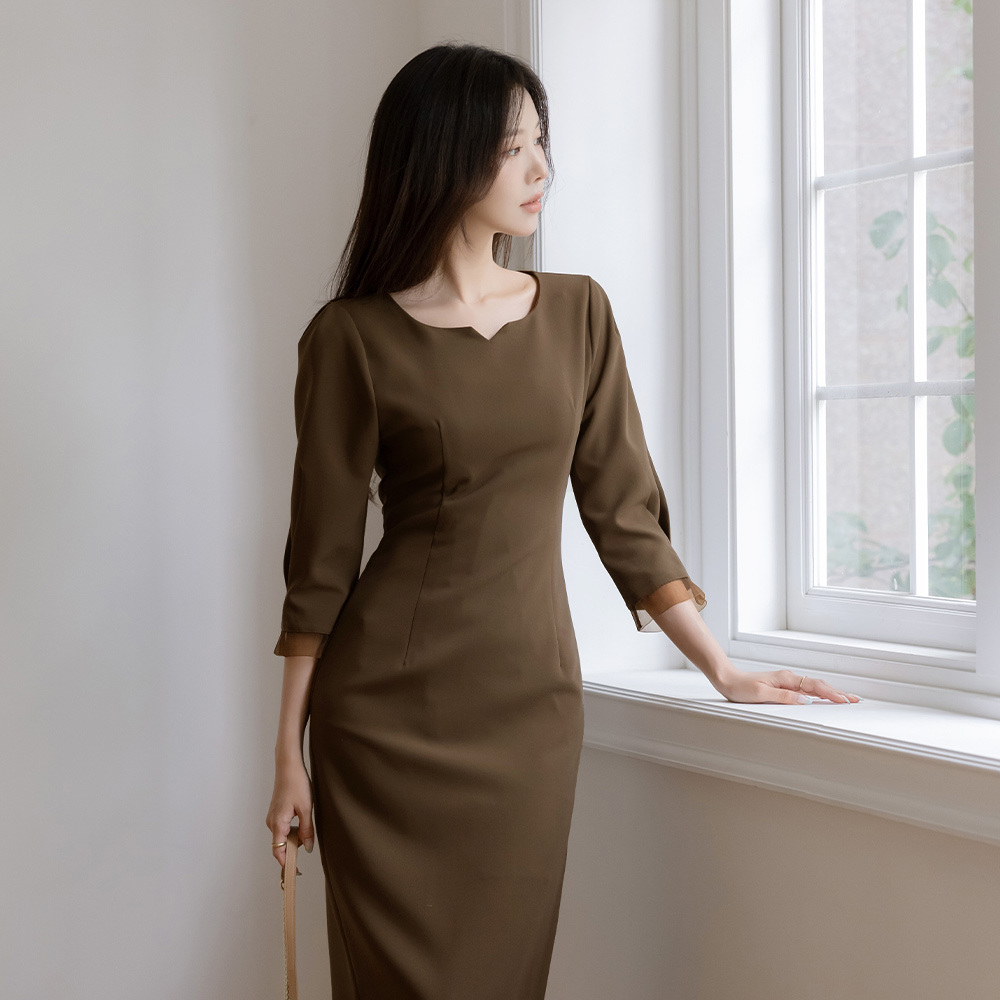 透明硬纱 配色 H字型 7分 连衣裙
