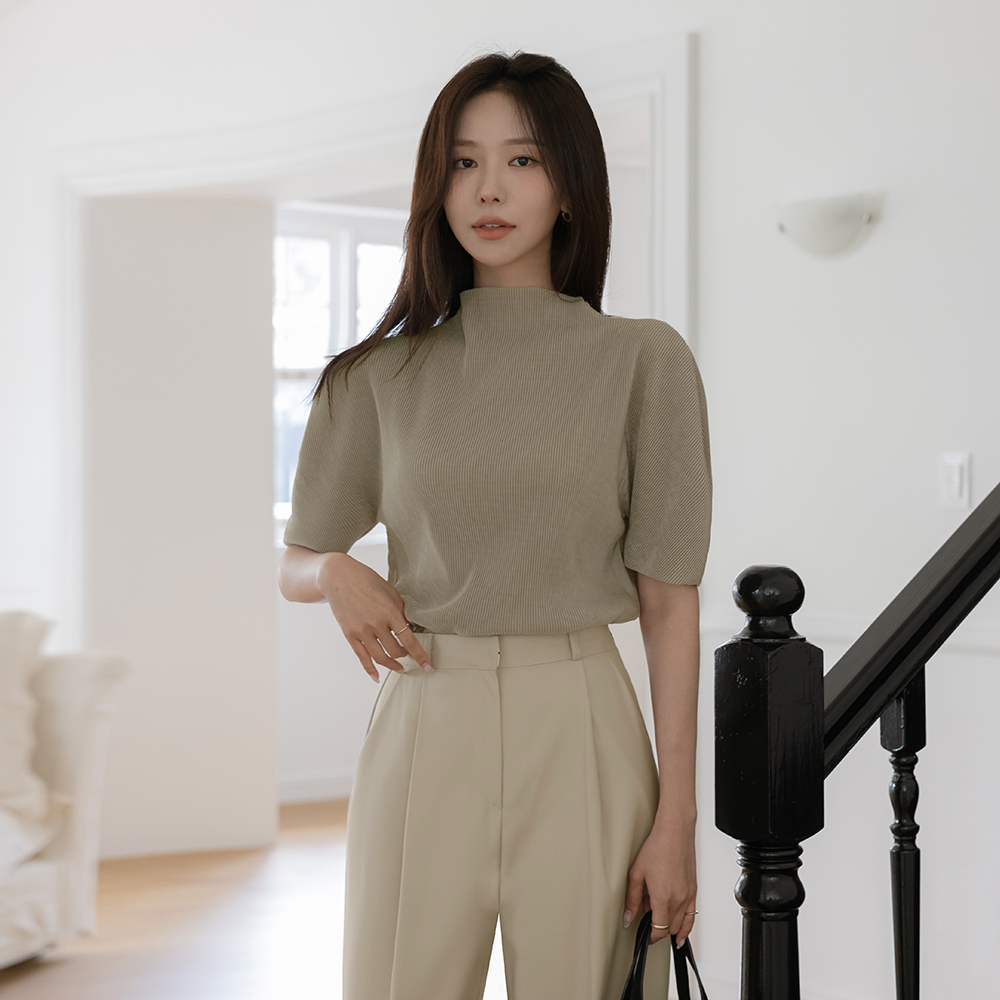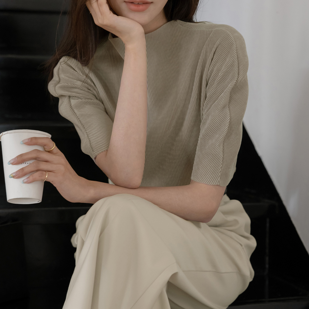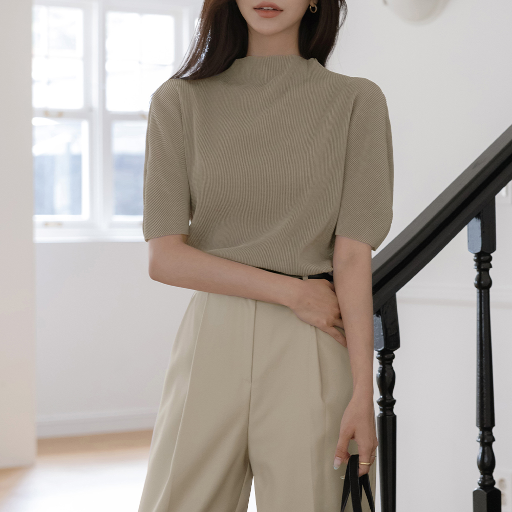 半高领 丝绒 褶边 短袖 T恤衫