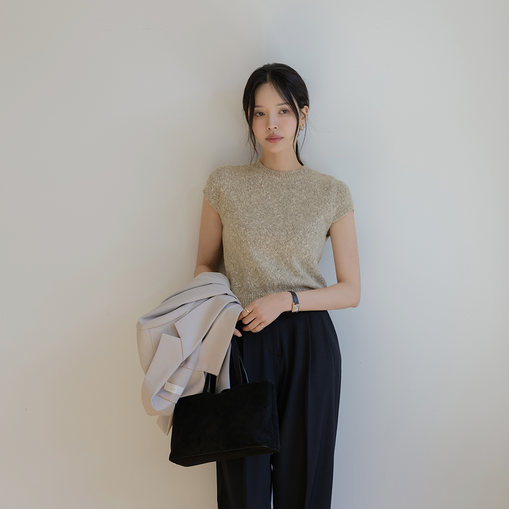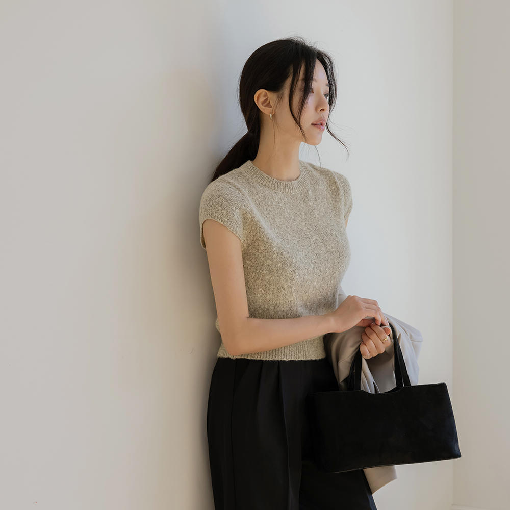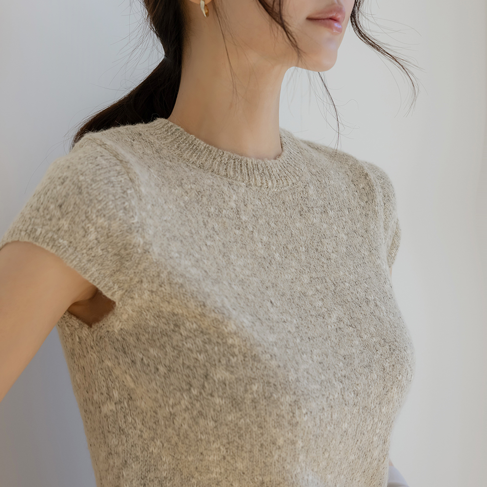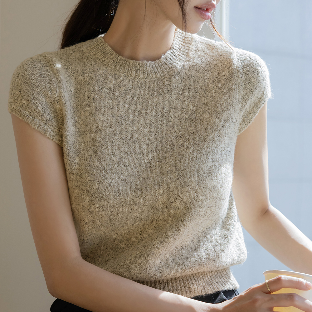 圆领 混合 帽檐袖 短袖 针织衫