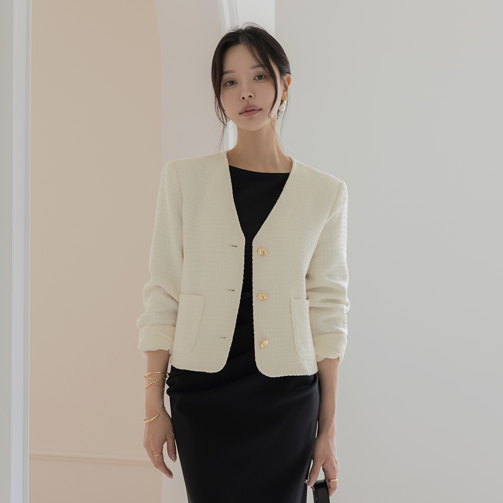 闪亮 无领 黄金 扣子 粗呢 夹克