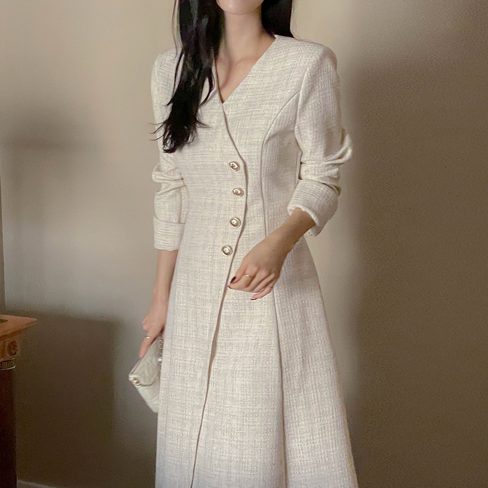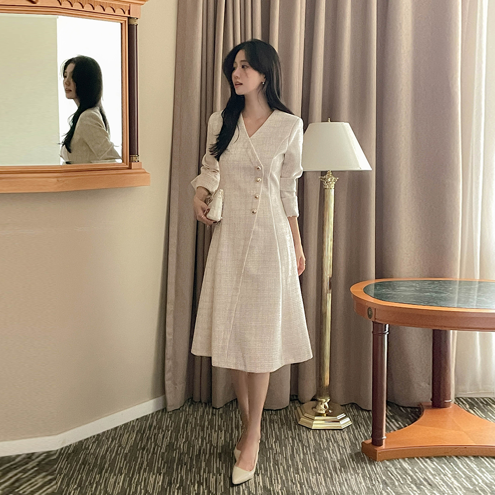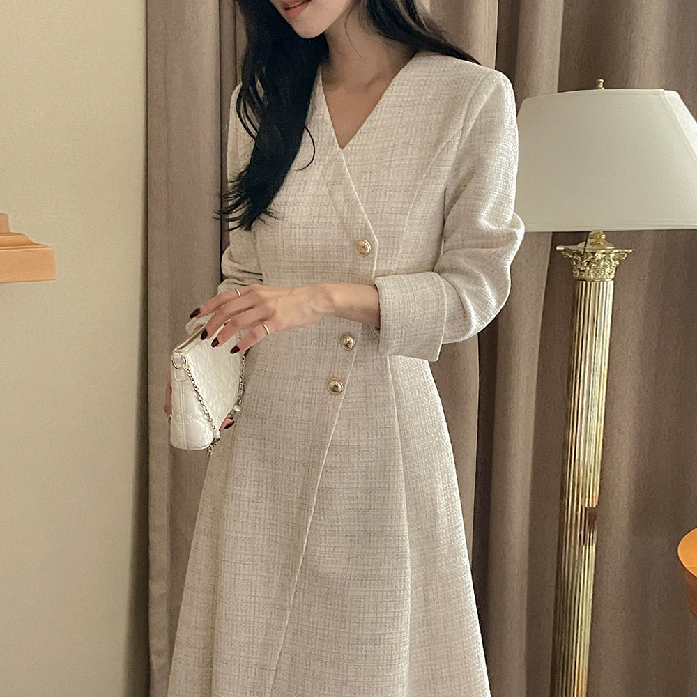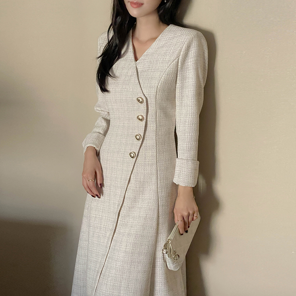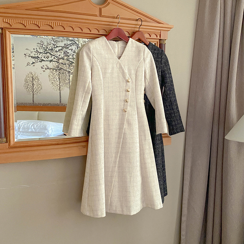 Merry 斜线 扣子 粗呢 长款 A字型 连衣裙