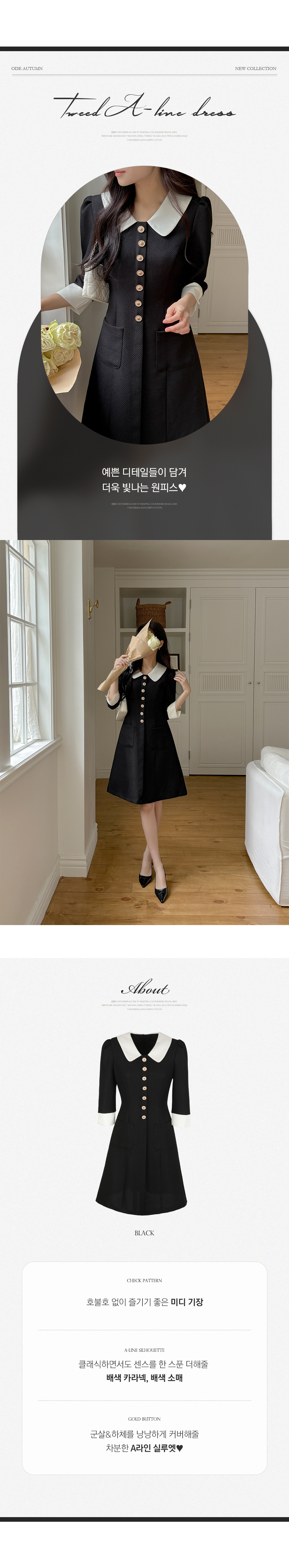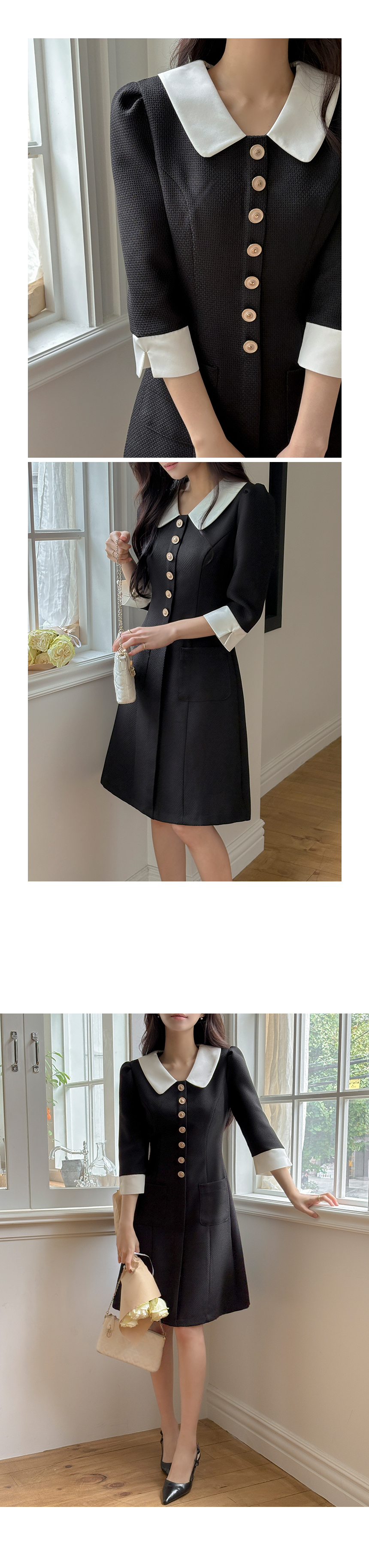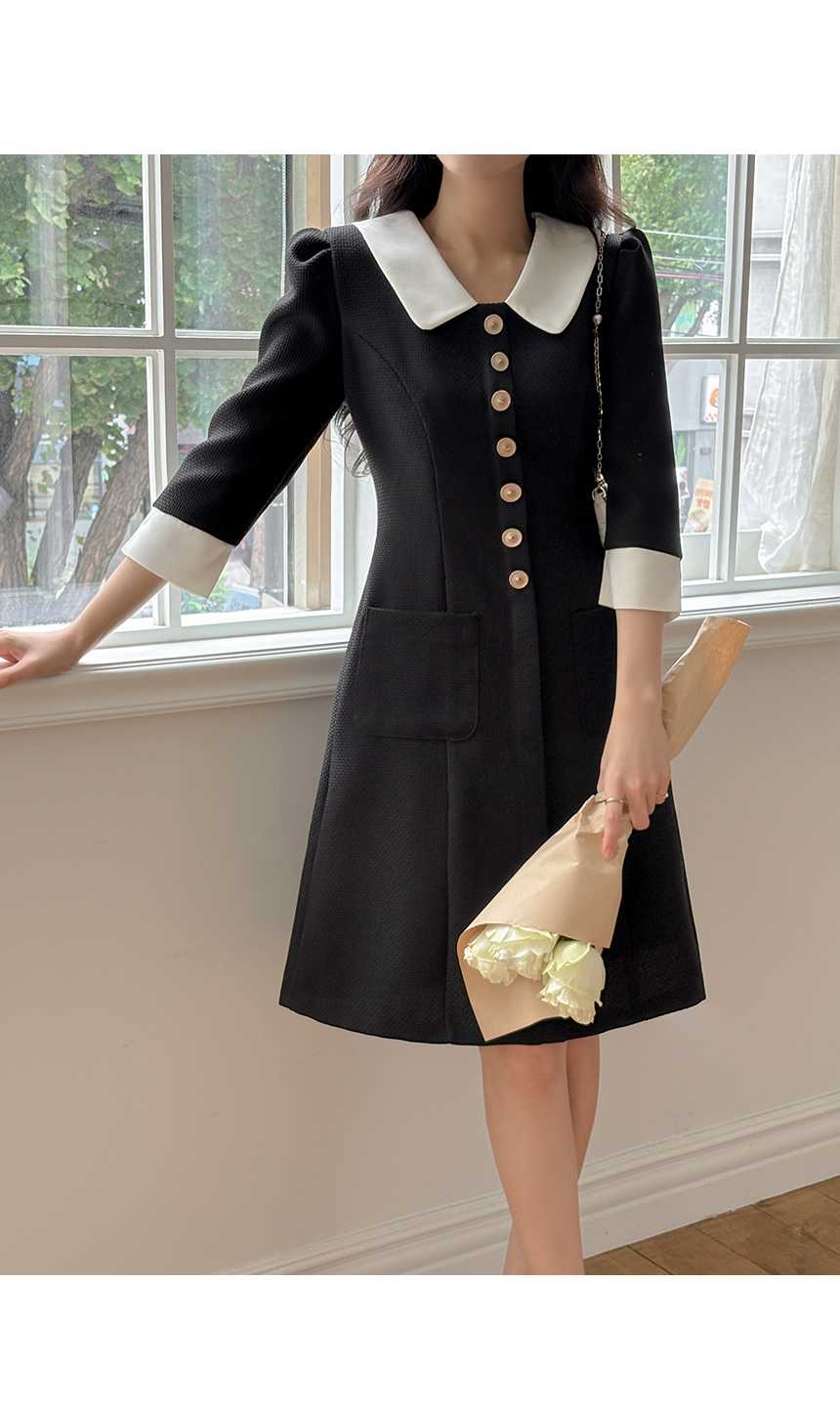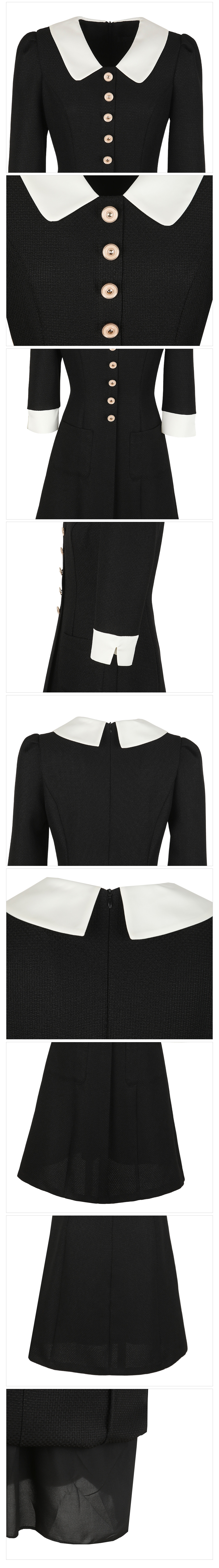 로미 配色 领子 粗呢 A字型 连衣裙
