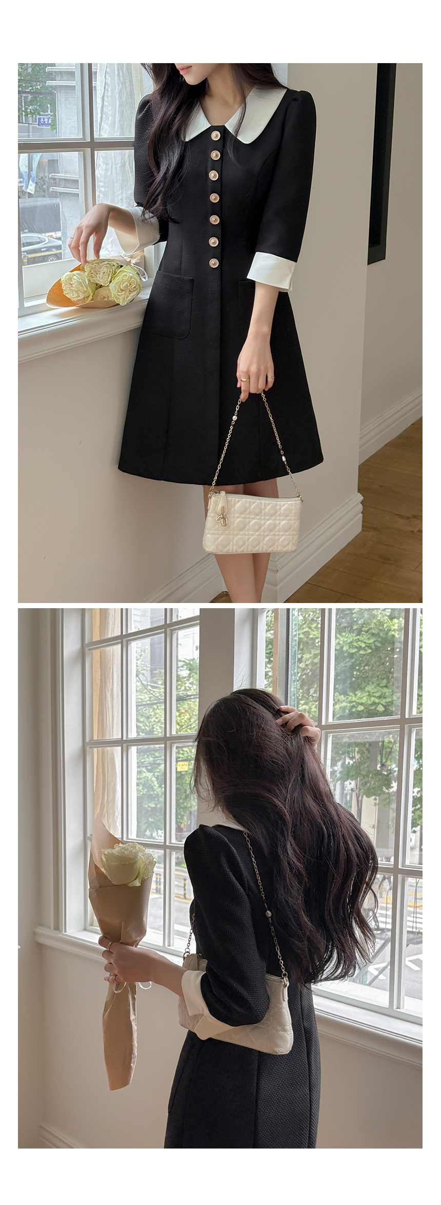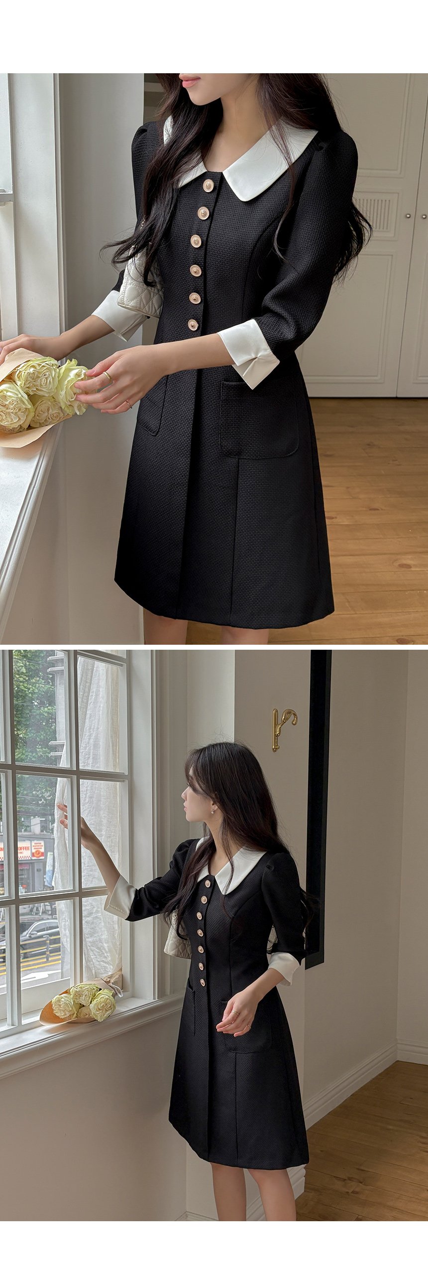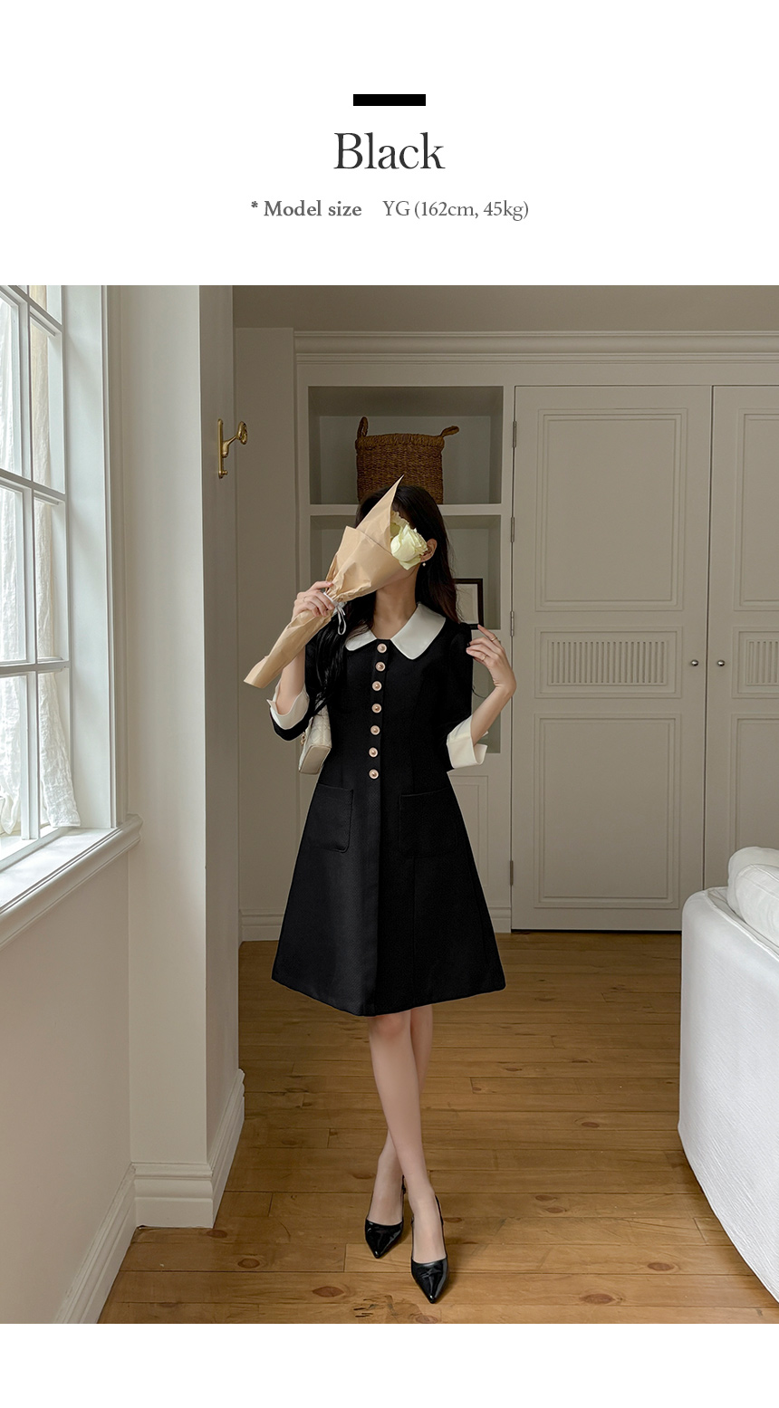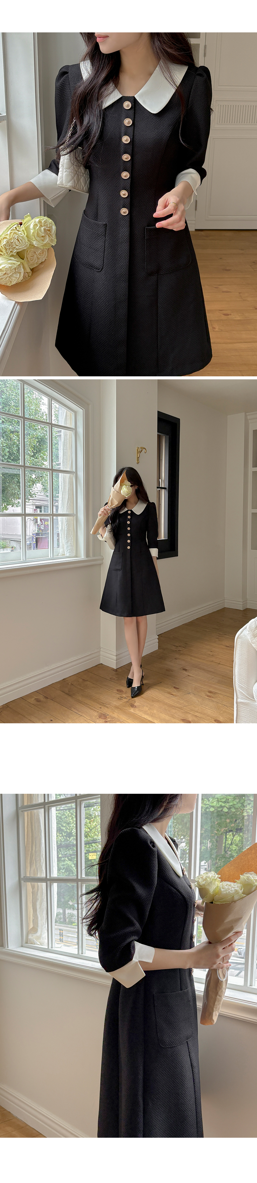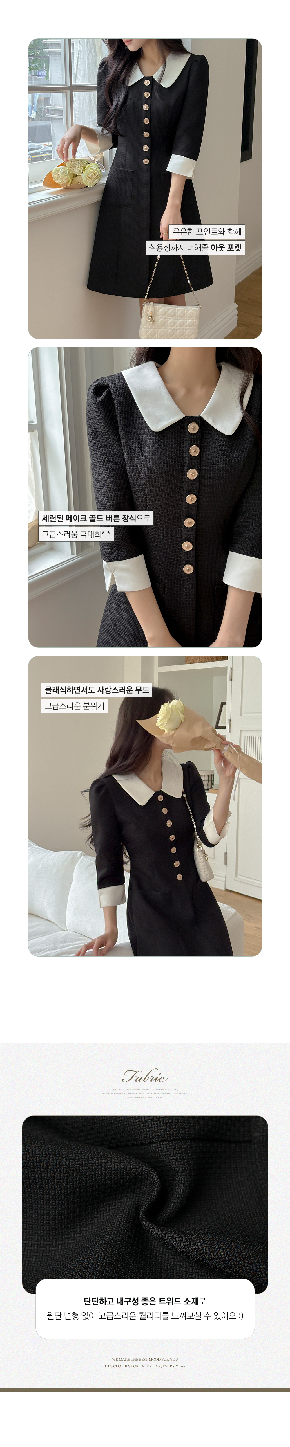 로미 配色 领子 粗呢 A字型 连衣裙