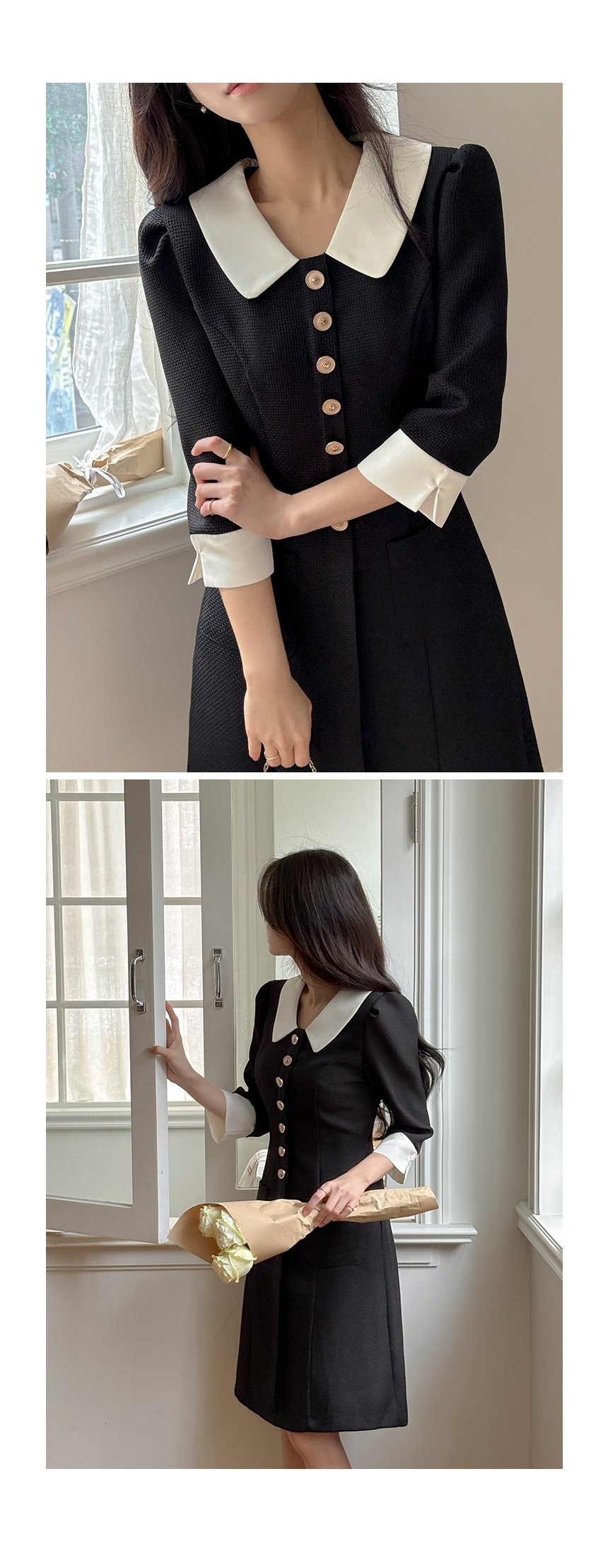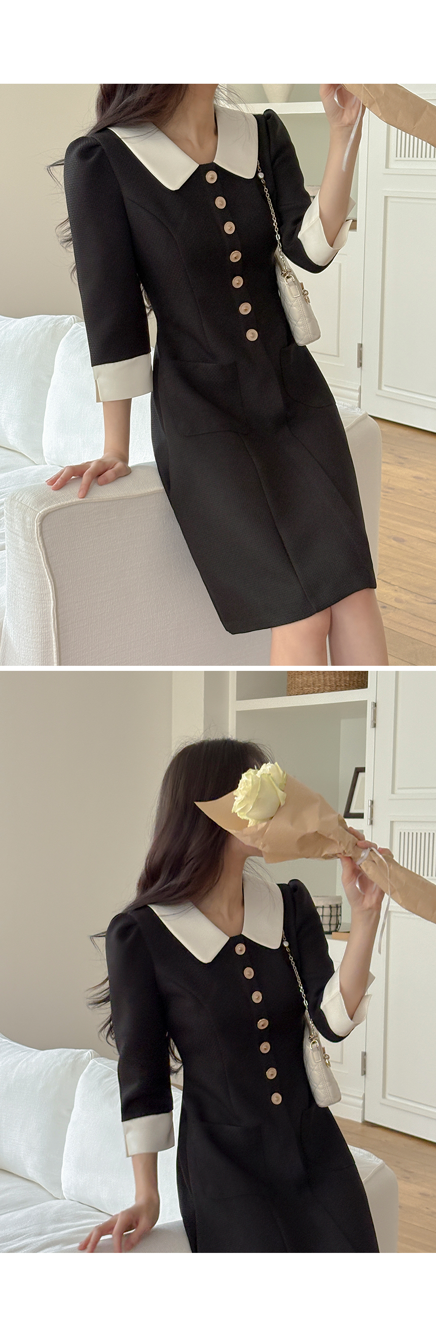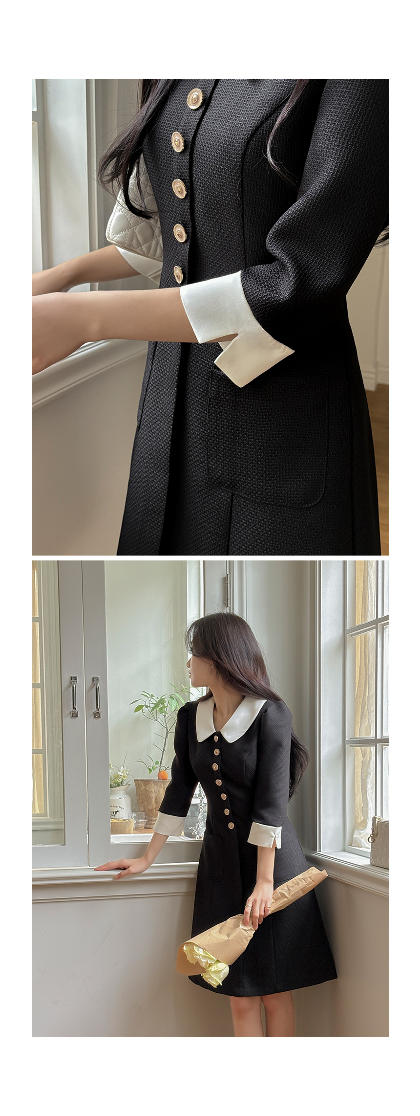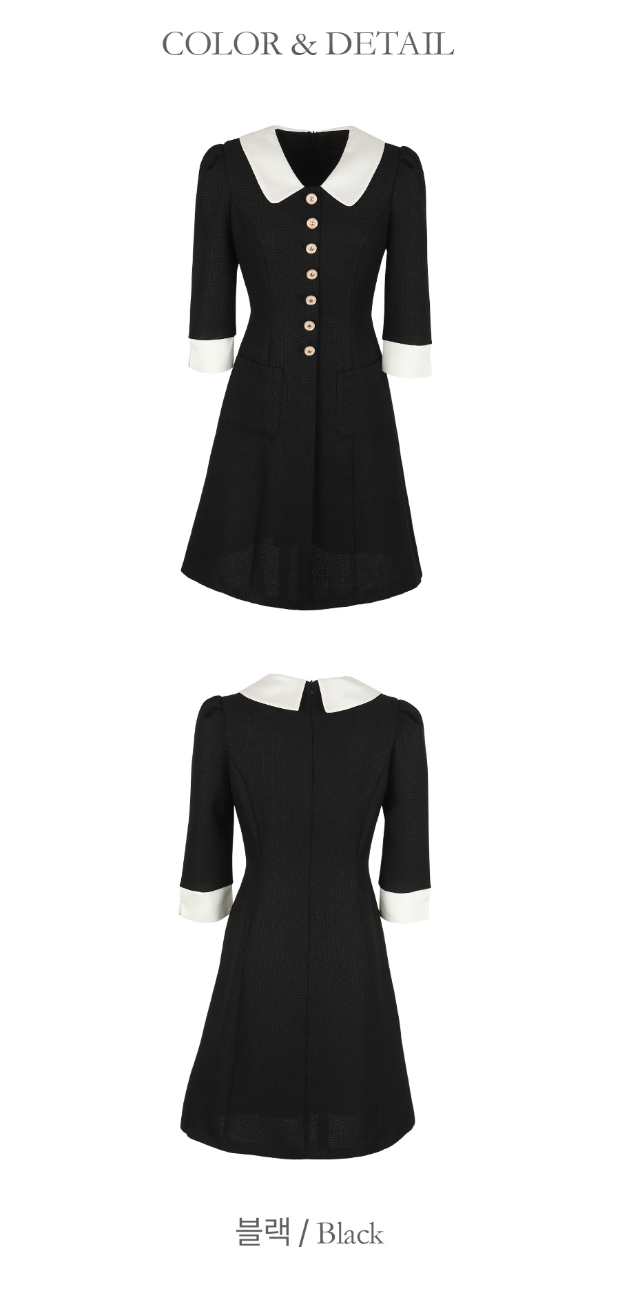 로미 配色 领子 粗呢 A字型 连衣裙