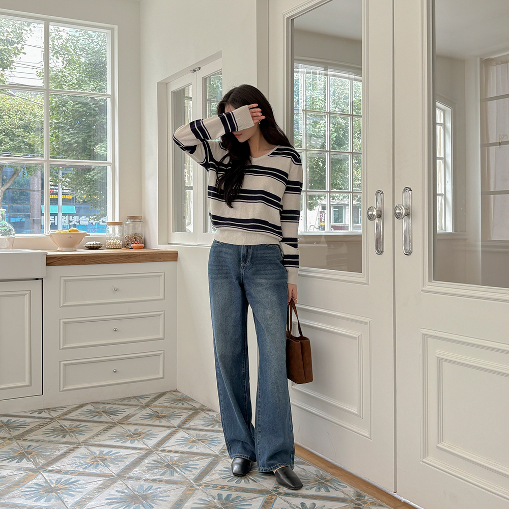 羊绒&羊毛 横条纹 V领 针织衫