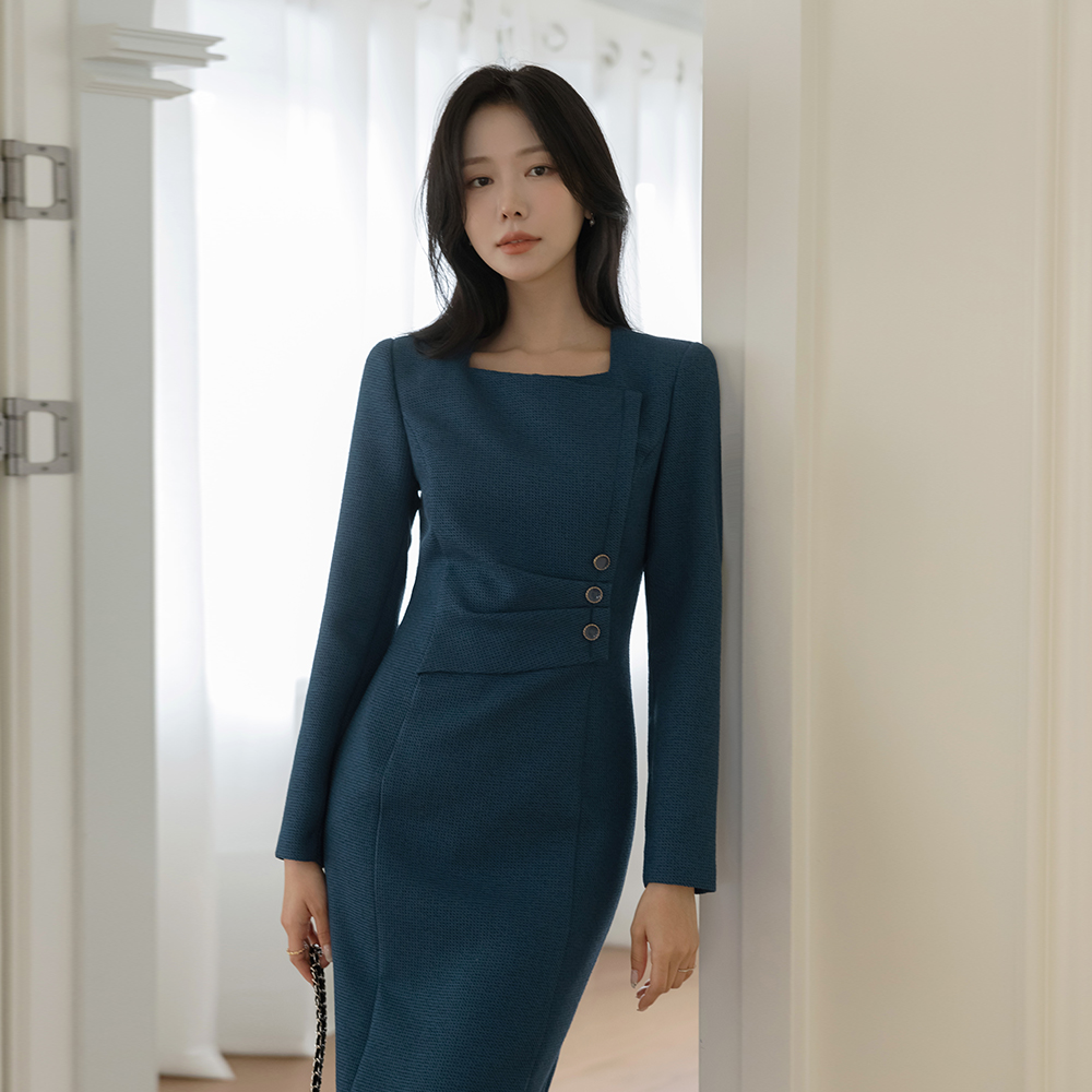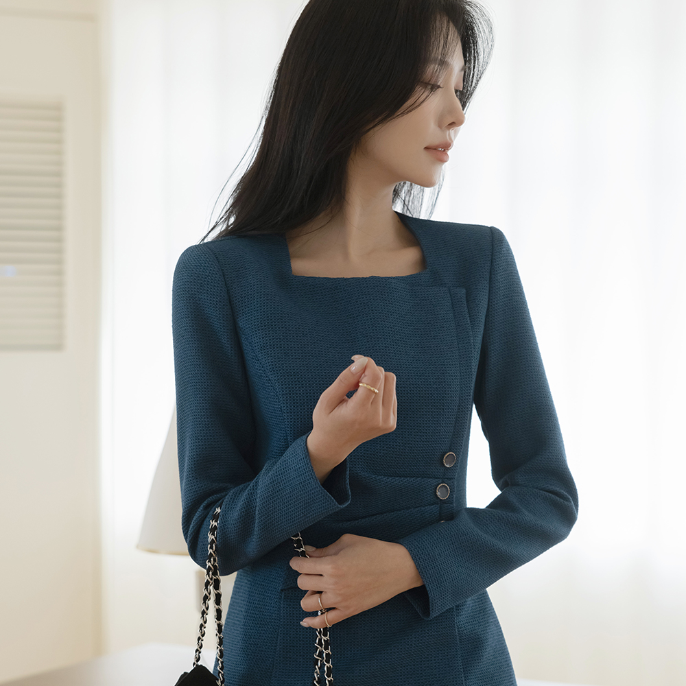方领 不规则 褶皱 粗呢 H字型 连衣裙