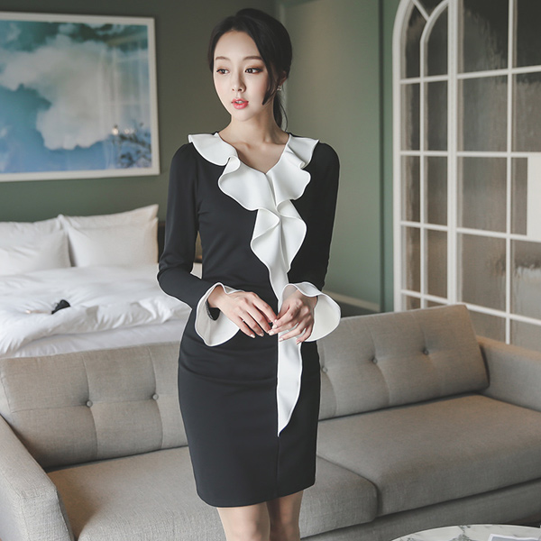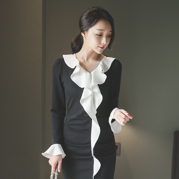 黑白配 荷叶边 褶皱 连衣裙