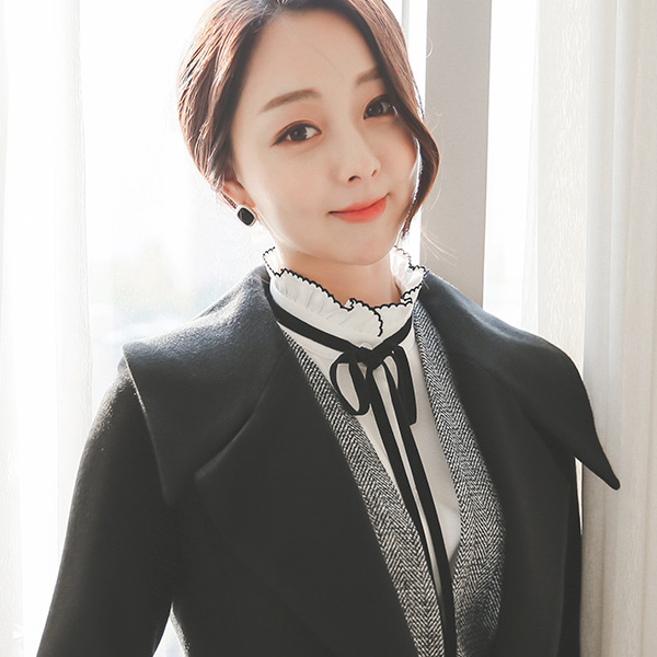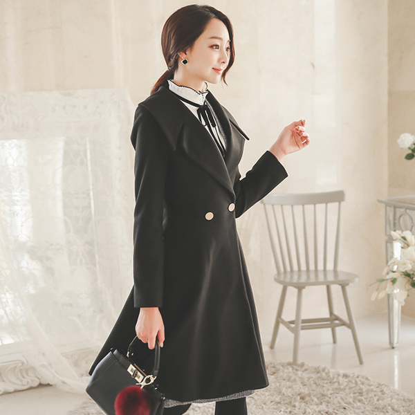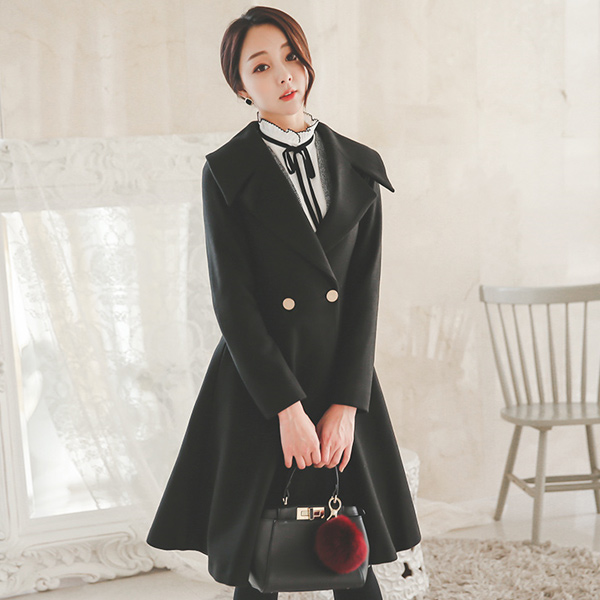 宽卡拉金色纽扣波浪群/喇叭裙羊毛大衣