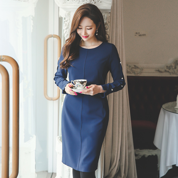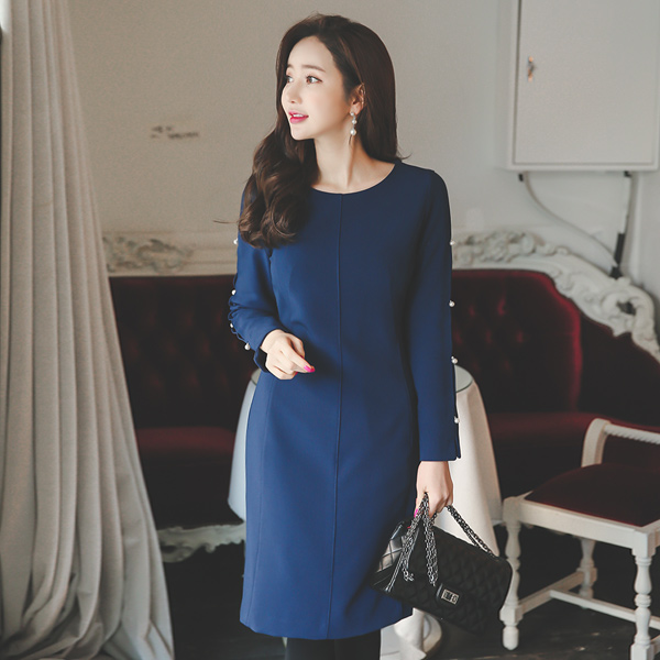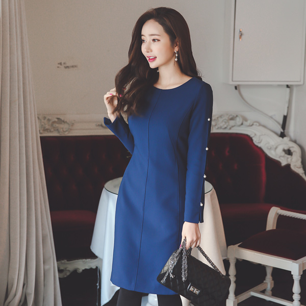 珍珠狭缝套筒切口连衣裙