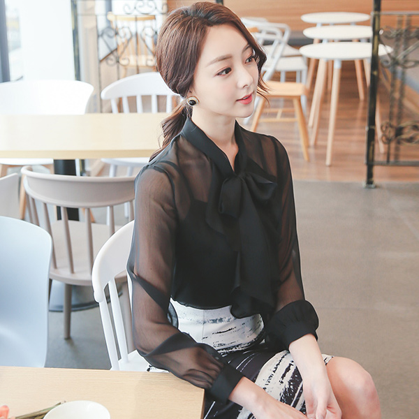 牛油果丝带皱褶透明女人衬衫